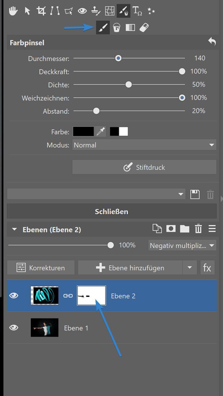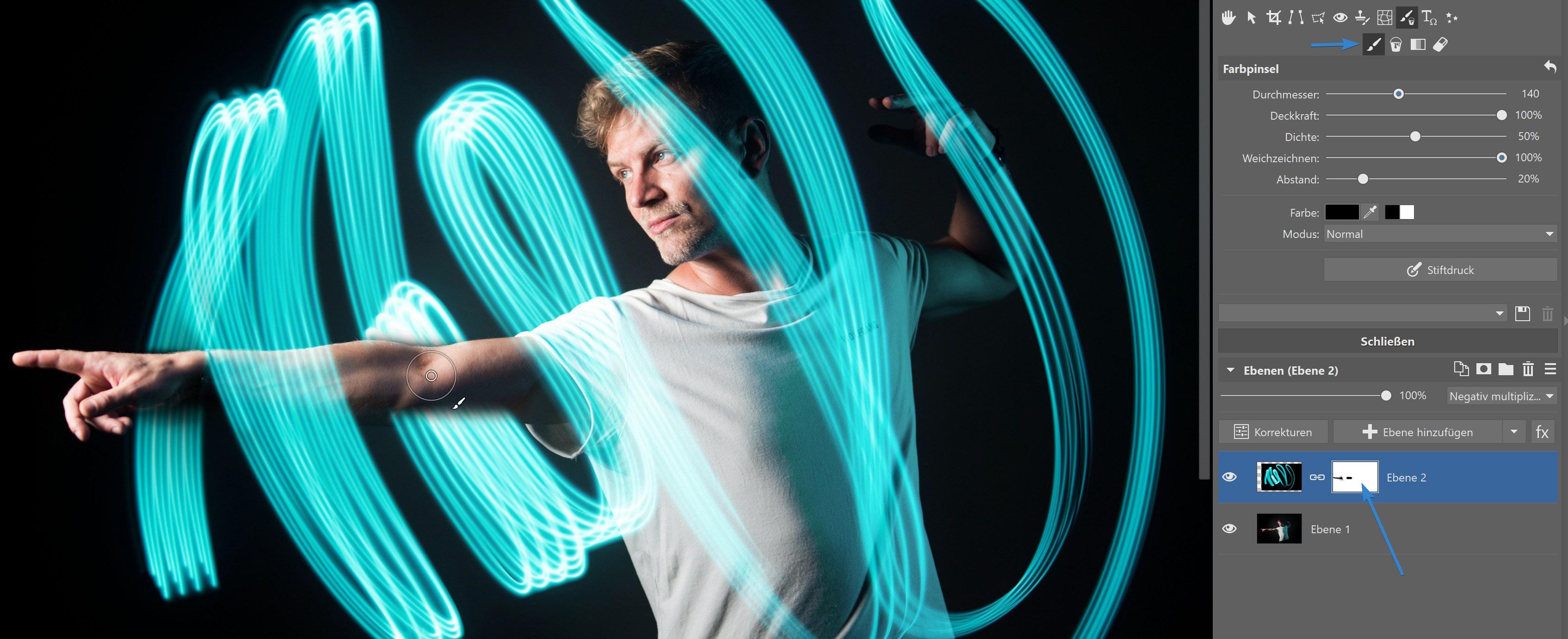 das Pinselwerkzeug, stellen Sie es auf einen höheren Weichzeichnerwert und Schwarz ein und malen Sie in die Maske, damit einige Teile hinter dem Model liegen. Wechseln Sie nach und nach zwischen dem schwarzen und dem weißen Pinsel, um die Effekte so realistisch wie möglich zu gestalten.