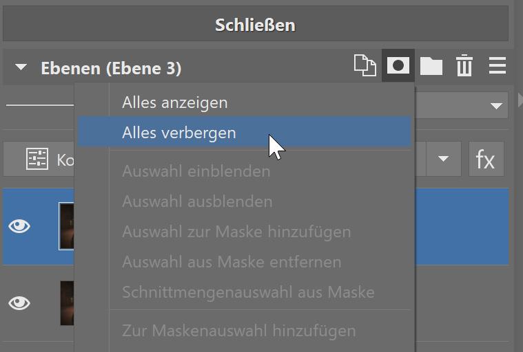 Klicken Sie mit der rechten Maustaste auf die oberste Ebene und wählen Sie Maske Alles anzeigen. Die Ebene enthält nun eine Maske, die vollständig freigelegt ist. Malen Sie die Teile, die Sie abdecken möchten, mit einem schwarzen Pinsel über. Wählen Sie