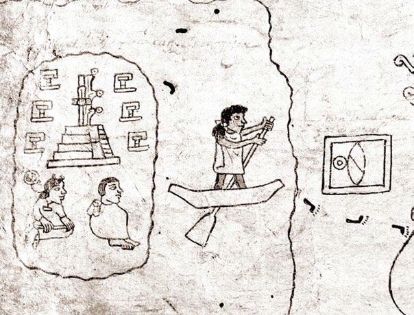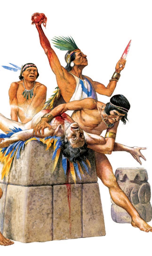 a samém vrcholku chrámu p ed svatyní boha Huitzilopochtliho stál krvavý, oltá i podobný kámen a n m vykonávali kn í lidské ob ti olo ili na n j ob tovaného a vy ízli mu z hrudi ješt bijící srdce rvácející t lo pak shodili po schodech dol , stejn jako byla podle le endy o Hadí ho e svr ena bohyn Coyol auh ui
