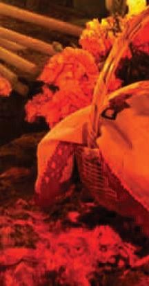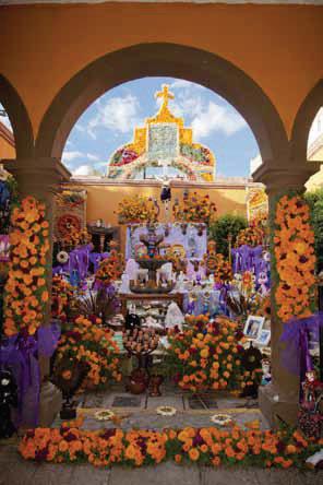 ohat zdobený oltá s jídlem, otogra iemi a kyticemi a rikán na oslavu Dne mrtvých