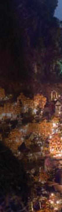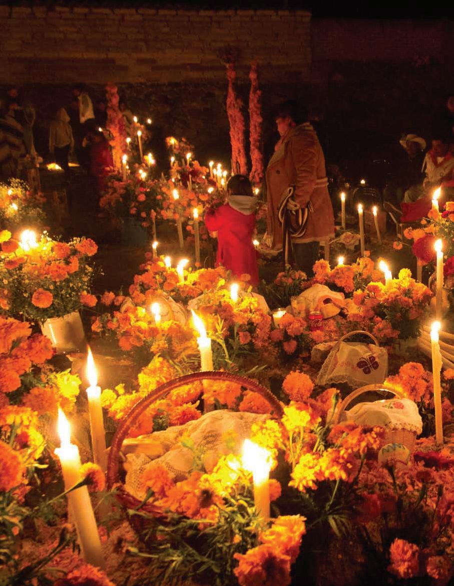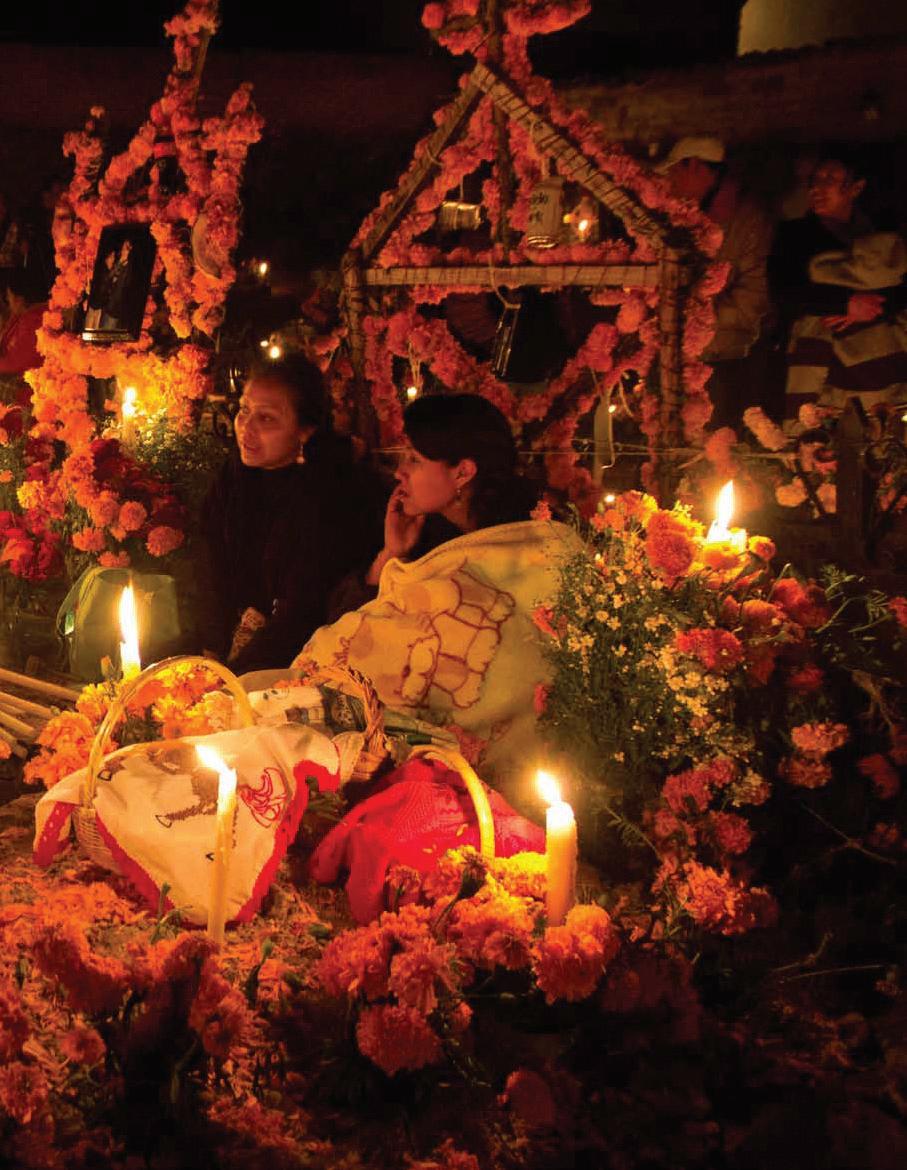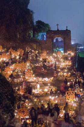Den mrtvých v oblasti jezera Pátzcuaro. Lidé zde poslu ni tradice zdobí hroby a rikány a r znými ob tinami a tráví noc u míst posledního odpo inku svých zesnulých p íbuzných