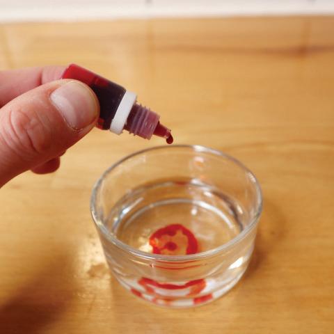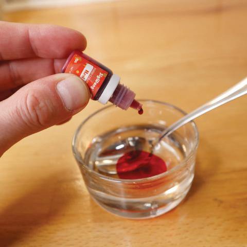 1. Potřebujete čtvrt hrnku vody, do kterého přidejte 5 kapek červeného potravinářského barviva.