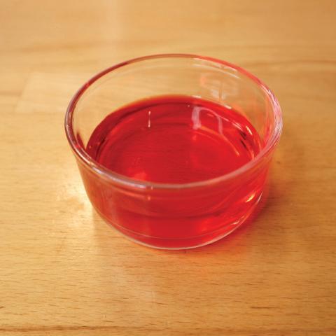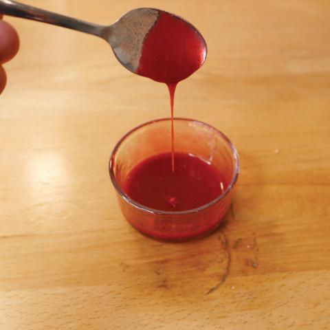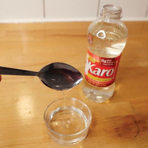 1. Vezměte dvě lžíce kukuřičného sirupu a přidejte čtyři kapky červeného potravinářského barviva.