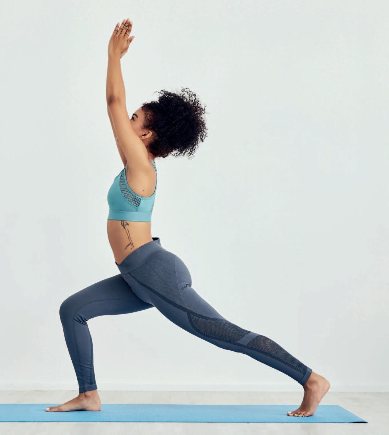 n Pokud držíte rovnováhu, zvedněte ruce nad hlavu, dlaně směřuji k sobě a paže jsou rovnoběžné. Ramena nechte klesat od uší dolů a vytahujte se přes paže až do konečků prstů (C). Vydržte na pět nádechů.