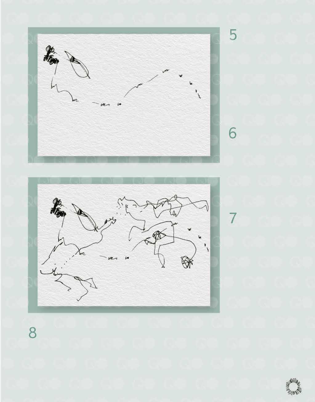 Vnímejte při kreslení své prsty, paže, střed těla i dech. Buďte k sobě něžní a nespěchejte. Čím pomaleji budete kreslit, tím jednodušeji si budete všímat sebe samých. Zkoušejte odlišné způsoby čmárání a přemýšlejte o tom, jak různé pohyby ovlivňují váš zážitek z kreslení a jaké pohyby vám jsou příjemné. Jakmile najdete to pravé, chvilku se toho držte.