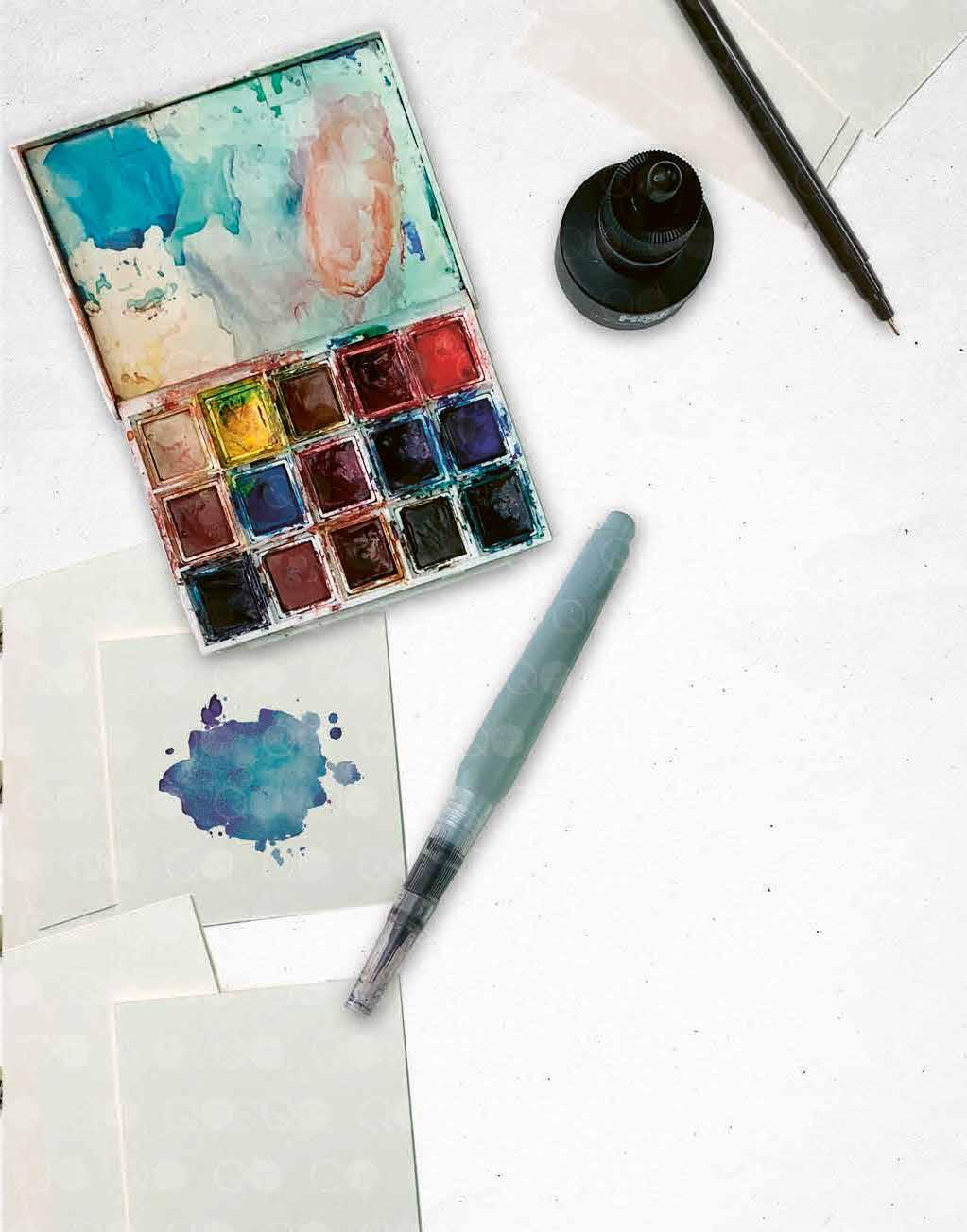 Předpřipravené materiály jsou klíčem k tomu, abyste kreslení zahrnuli do svého dne. Hned jak budete mít volnou chvilku nebo se dostaví vlna inspirace, můžete vzít pero do ruky a bez zbytečných příprav a rozptylování začít kreslit. Pomůžou vám i předem nachystané a nastříhané kartičky akvarelového papíru. Já mám díky nim pocit většího prostoru pro riskování a zkoušení nových věcí. Papírky mi totiž nepřipadají tak „vzácné“. Předpříprava pro tvoření je navíc skvělou aktivitou, když zrovna chcete tvořit, ale nepřipadáte si kreativní. Nastartujete tím motor pro příští tvořivé sezení. Pro pomalé kreslení si můžete dopředu nastříhat spoustu papírků. V této knize používám kartičky o velikosti 9 × 6 cm, nebo 7,5 × 7,5 cm, ale určitě můžete použít i kartičky jiných rozměrů.