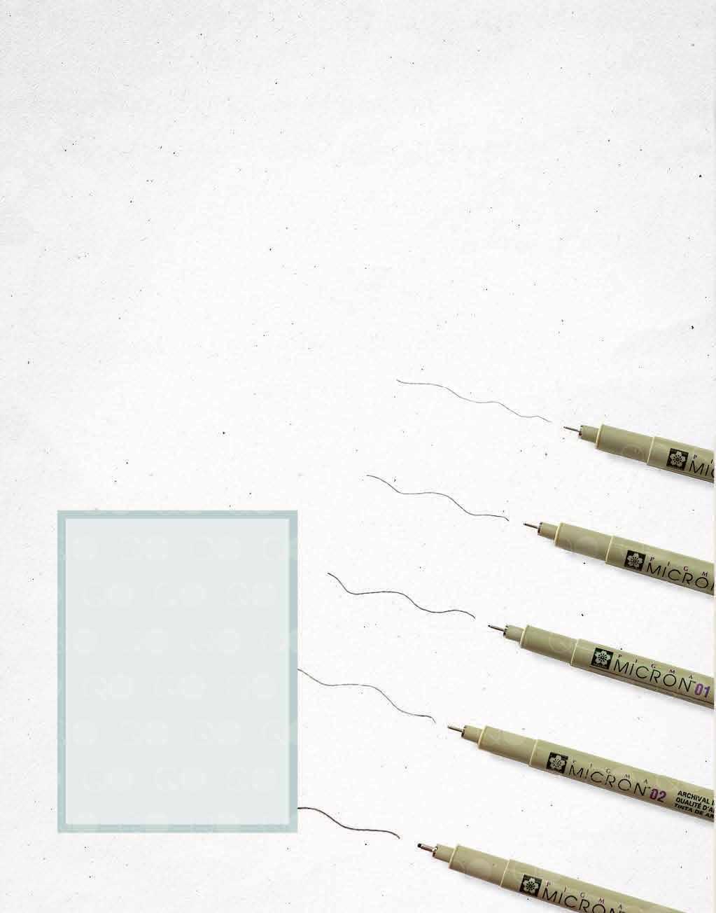 Volitelné – další pera: Technická pera Micron 003, 005, 02 a 08 – většinou je seženete v černé, existují ale i v sépiově hnědé barvě.