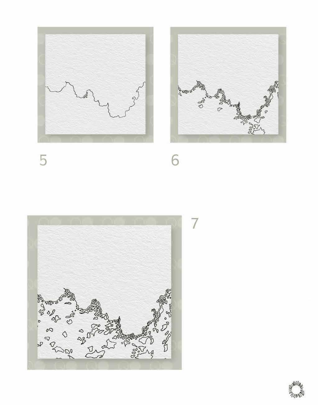Tento vzor je inspirován nádhernou chaluhou, které se říká kelp. Vzor má po okraji rostoucí svahy a ostré špičky a zevnitř spoustu dírek. Můžete si o kelpu něco zjistit. K čemu dírky slouží? V jakém prostředí chaluha žije? Najděte si její fotky, prozkoumejte je a zaměřte se i na dírky. Jaký mají tvar? Připomínají vám něco? Poté prostudujte i okraj řasy se všemi křivkami, špičkami a prohlubněmi, abyste vzoru lépe rozuměli. Jakmile budete připraveni pustit se do kreslení, všechny fotky a informace, které jste získali, dejte stranou. Pokuste se vzor chaluhy kreslit pouze za pomoci nabytých poznatků a vaší představivosti.