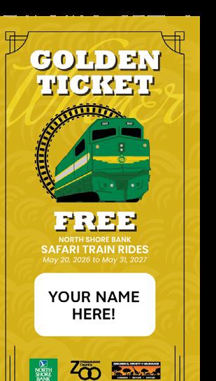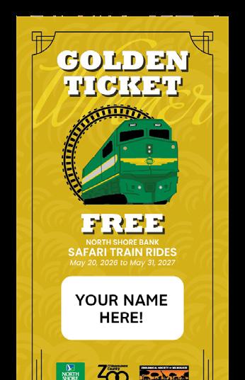 The train is now boarding, and you can still catch a ride with a Golden Ticket! Once again, the Society is hosting a Golden Ticket contest for the North Shore Bank Safari Train. New this year! North Shore Bank, the Milwaukee County Zoo and the Zoological Society are giving TWO lucky winners a ticket for free rides every time the train is running through May 2027. The Golden Ticket will also be good for rides during special events like Nights in June, Boo at the Zoo and Wild Lights. You know what’s even better than taking a ride on the train? Going with family! Each winner of the Golden Ticket will also get three more passes for their family members.