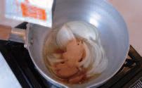 slice the onion and place it into a pan along with the donburi mix and 80ml of water Put the pan on to boil 1