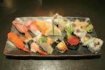 sea-bream, ornately laid out in rows of sashimi slices between the head and tail (left intact), accompanied by burdock, aubergine and lotus root that have been scrumptiously fried in tempura batter