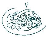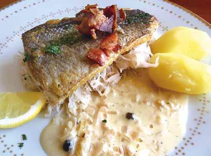 熱々にした皿に、シュークルートを敷き、その上にスズキをそっ とおき、きざんだパセリを散らし、ベーコンをのせ、まわりにソー スを流し入れ、ジャガイモとレモンを添え、即座に食卓へ。ワイ ンは、キリッと冷やしたリースリング。(真)