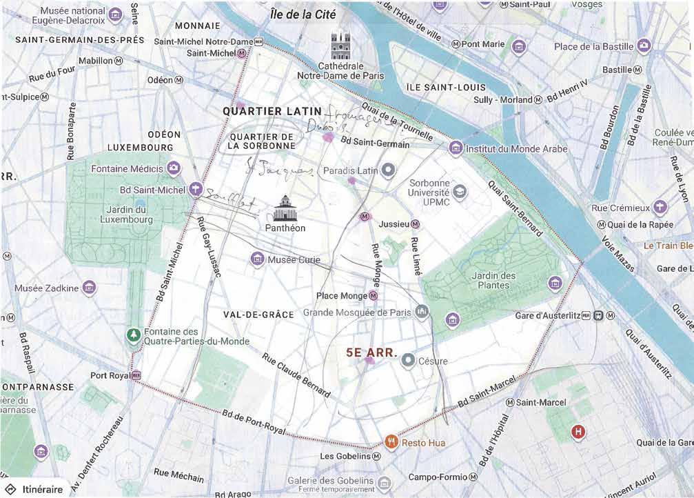 「5区では、1〜2世紀にローマ人が造ったクリュ ニー浴場やリュテス円形闘技場、5世紀の聖ジュ ヌヴィエーヴの足跡から21世紀まで、歴史の旅 ができるんです。今、ジュシュー大学とアラブ世 界研究所がある場所には、13世紀にサン・ヴィク トール修道院が設けられ、欧州の知の中心地と して名を馳せました。ジュシューの一帯が今でも サン・ヴィクトール地区といわれるゆえんです。フ ランス革命で宗教施設は国有化され、それが大 きな常設ワイン市場になると、周辺にレストラン、 パン屋、チーズ屋などが集まり食文化が育まれ ました。1582年に開店した「トゥール・ダルジャン」 のような質の高いレストランやワイン屋さんが多 いのも、そんな歴史があってのこと。カルチエ・ ラタンは外国人も多く世界の料理、工芸品、書 店もたくさんありますね」。そんな5区が大好きで、 日々歩いては発見したことを多くの人と分かち合 うための勉強と交流の会を設立して活動中。