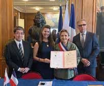 友好交流に関する覚書を手に。左から在仏日本 国大使館・山谷裕幸広報文化公使、ジャーナリス トのドラ・トーザン氏、フロランス・ベルトー5区長、 5区顧問フィリップ・ブシェ氏。