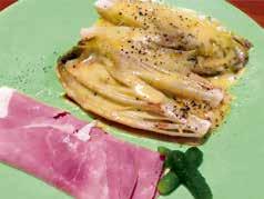 分として80グラムほどボウルにとり、ポマー ド状の生クリームを大さじ2杯混ぜ入れる。 アンディーブは一番外側の葉をとりのぞき、 縦半分に切り分ける。根元の芯の固いとこ ろに、火が通りやすいように縦に切れ目を 一つ入れる。切り口の方を上にして各人の 皿にのせ、オリーブ油とバルサミコ酢少々 を振りかけ、塩、コショウ。電子レンジ用 のふたをして700wに合わせたレンジに入 れ、4分たったらとり出す。二人分めも同じ ように火を通す。アンディーヴから皿に出てく る水気をキッチンペーパーでふきとる。アン ディーブをチーズと生クリームのミックスでおお い、レンジにもどしてもう3分たったらでき上がり。 ハムとコルニションを添えて食卓へ。とろける チーズの香りと軽く苦いアンディーヴの風味が 一つになったうまさ!(真)