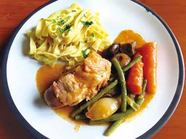 大きめのココット鍋にオリーブ油を多めにとって中火にか け、小さく切り分けたベーコンlardonsを入れる。しばらく いためて脂がにじみ出てきたら、塩、コショウしたウサギを 加えて混ぜ合わせる。白ワインを注ぎ、ウサギがすっかりか ぶるように水を入れる。セロリを加えたブーケガルニ、チキンの ブイヨンキューブ、マスタード、濃縮トマトを混ぜ入れ、ふたを して煮込んでいく。沸騰したら弱火に落とす。 40分たったらニンジンを加える。さらに20分たったら新玉ね ぎを入れる。もう10分たったらサヤインゲンとマッシュルーム、 それにレバーも入れ、もう15分ほどたてばウサギの肉は骨から はなれそうなくらいにやわらかくなっているだろう。塩、コショウ で味を調え、beurre maniéとよばれる、バター 50グラムと同 量の小麦粉を練り合わせたポマード状のものを、小さじにとっ ては煮汁に少しずつ混ぜ入れる。こうするとだまができないし、