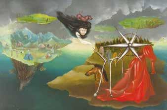 神秘主義、錬金術、先住民の文化などが混じっ た独自の世界で、住む場所が変わっても年齢を重 ねても、その作風には一貫性がある。17歳の時の 水彩画は、自分が作った物語の登場人物を描い たもので、豊かな想像力と精緻な筆で、その後の