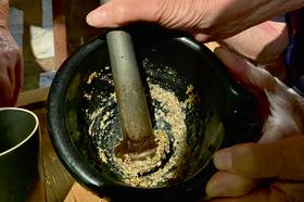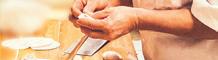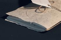 いていたが、今は化学繊維の増加で業者 がおらず、麻や綿の繊維を買うのだそうだ。 その繊維に水を混ぜてから、紙漉き型で すくう。それを合成フェルトのマットの間 にはさんで何枚も重ねていき、プレス機で 水分を取って数日間おく。その後、1枚ず つ1~2.5日乾かせば出来上がりだ。