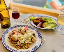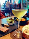 広々と落ち着いた店内で、ゆっくりワインが楽しめるワインバー。ブル ゴーニュをはじめ、国内外から厳選されたワインのボトルが壁1面にずら り。食事メニューは、シャルキュトリーやチーズ、テリーヌ、サラダなど のタパスたち。グラスワインも常時10種類ほど用意されている。