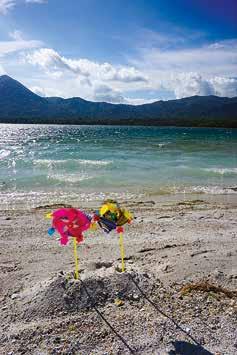 Là encore, il y a une explication scientifique à cela. Le sable contient beaucoup de dacites, une sorte de quartz coloré qui se forme lorsque le magma durcit. Quant à l’eau, si elle est si limpide, c’est parce que du sulfure d’hydrogène s’échappe du lit du lac, ce qui la rend très acide (l’équivalent d’un jus de citron) et empêche la prolifération des bactéries. En effet, au bout d’un certain temps, on se rend compte qu’il n’y a pas de poissons dans le lac, pas d’animaux dans les environs et pratiquement pas de plantes à perte de vue. L’absence de créatures vivantes contribue à l’atmosphère inquiétante et infernale du mont Osore.