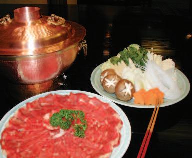 beef, ser ved tog ether with tofu and an array of veg etables such as Chinese cabbag e, carrots, shitake and