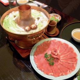 Using chopsticks, one takes one sl ic e of the meat, submerg es it into a nabe full of hot kelp soup