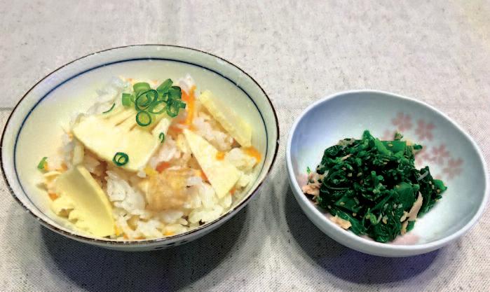 (Rice with bamboo shoots and rape florets with sesame seeds)