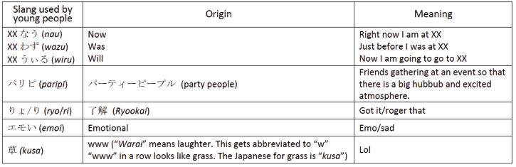 Had you heard of or seen any of these words before? These words are said to be born on and popularised by social media “なうnau ” is used when you are going on a trip or meeting with your friends to tell your friends briefly what your current location is, for example: “大阪なうOsaka nau (I’m in osaka)”