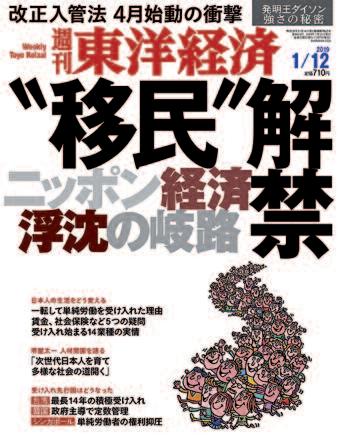 crisis as the sole basis to justify their readiness to open the borders. This is why it remains a particularly sensitive subject, which is still causing a lot of ink to flow The financial press, such as the weekly magazine Toyo Keizai, is somewhat in favour of the prospect of welcoming a workforce which the country needs so badly today Concerned about supporting the economy, Prime Minister Abe wants to meet the needs of companies at the expense of further reflection on the matter Indeed, the weekly magazine Shukan Kinyobi highlighted this fact in the issue it devoted to the subject at the beginning of the year While Toyo Keizai chose to feature lots of smiling people on its cover, all obviously happy to see the Land of the Rising Sun open