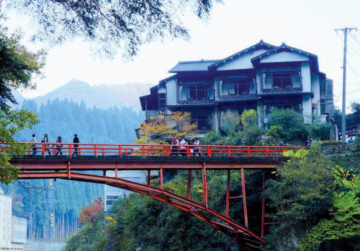 past the charming Sandankyo Hotel (the ideal p l a c e t o s o a k y o u r w e a r y m u s c l e s i n t h e onsen on the way back) and on to the start of the path which follows the river Here, the river mellows into a deep calm pool where you’ll see people in r e n