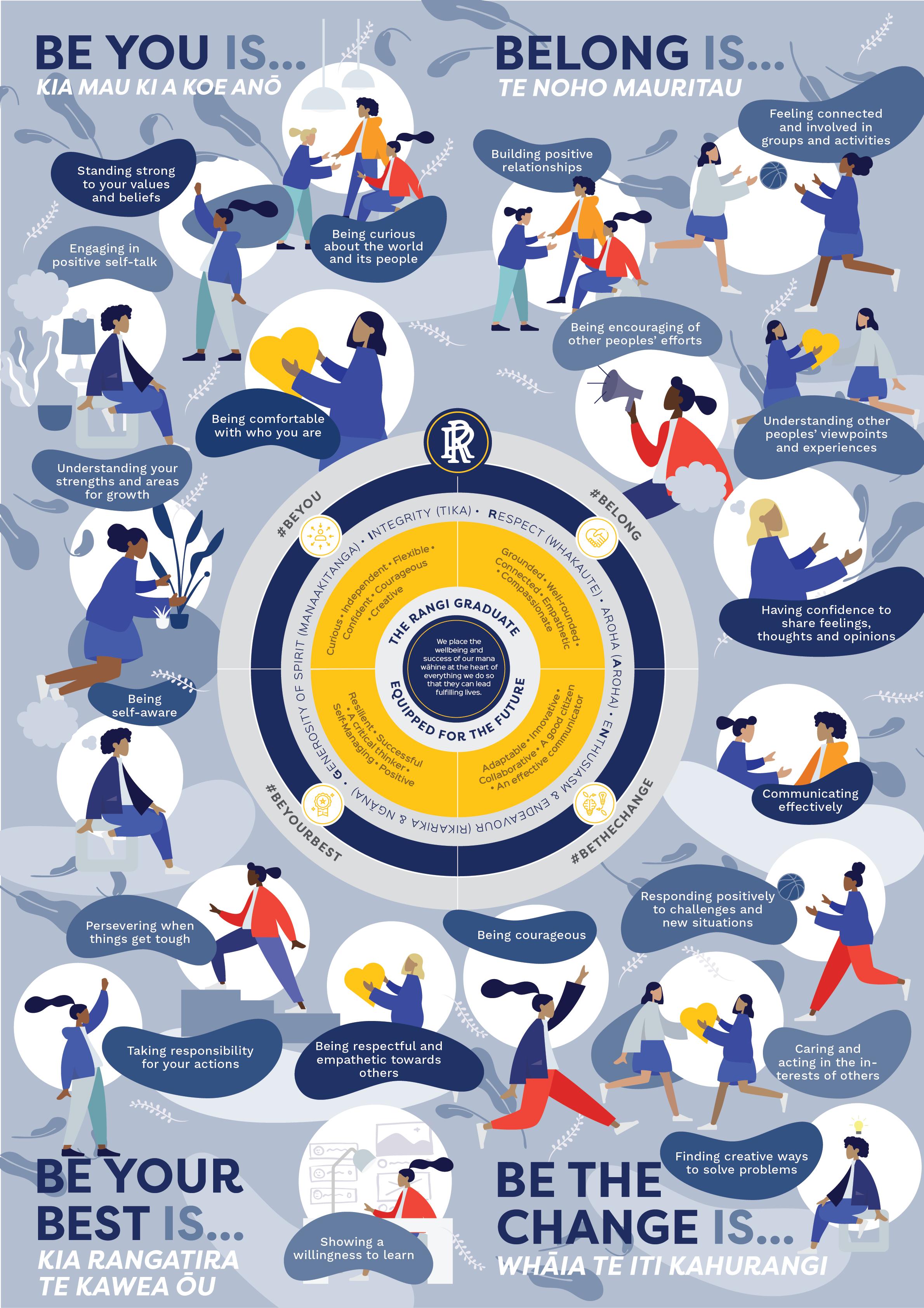 Life is unpredictable. While we never know exactly what challenges and triumphs lie ahead of us, research shows there are certain skills and behaviours we can learn and practise that will help us thrive. These skills and dispositions are highlighted in the Rangi Graduate Profile. This aspirational profile applies these essential