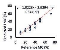 HSI (950–2500 nm) combined with artificial intelligence predicted LMC in all litter type and age with R2 of 0.98 for the independent test samples. Reducing the spectral range to 950–1000 nm, reduced the R2 of the general model to 0.89 (Figure 3). Separating the samples based on litter type (pine, hardwood and re-used hardwood) increased the 950–1000 nm prediction R2 to over 0.91 for each litter type (Figure 3). The prediction algorithms were applied to a re-used hardwood litter sample to produce a gradient map of moisture content (Figure 2-right).