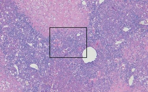 Figure 4 – (A) Multifocal to coalescing, variably organized granulomas infiltrated by Histomonas trophozoites. At higher magnification (B) Histomonas trophozoites replaces normal hepatic tissue.