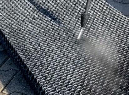 La speciale disposizione delle superfici solide e delle strutture a rete (design brevettato) assicura una distribuzione ideale dell’acqua attraverso il pannello con una minore perdita di pressione rispetto ai pannelli in carta. Ciò consente una corretta bagnatura e minori spruzzi, con conseguente capacità di raffrescamento altamente efficiente nelle regioni a clima caldo. L’uso di fogli di polimeri ad alta resistenza in combinazione con la saldatura termica garantisce la massima stabilità e una lunga durata. Inoltre, i pannelli in plastica possono essere facilmente