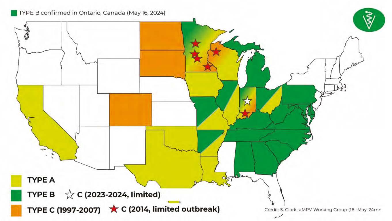 The virus is mainly associated with upper respiratory tract infections (turkey rhinotracheitis in turkeys and swollen head syndrome in chickens) leading to clumping and loss of cilia, which predispose the birds to secondary bacterial pathogens resulting in severe respiratory signs, high morbidity and mortality. The reproductive system also may be infected, resulting in a significant decrease in egg production (up to 70 % in breeder turkeys) and egg quality (poor shell quality, pale color, chalkiness and misshapen eggs) (VanBeusekom, 2024). Four subtypes of the virus (subtypes A, B, C, and D) are recognized, with subtypes A and B widespread in turkey and chicken producing countries around the world. The 2024 outbreak has consisted of two distinct subtypes. States in the eastern U.S. have been affected by aMPV subtype B, while western states have been affected by aMPV subtype A. All detections in previous years from aMPV were from subtype C.