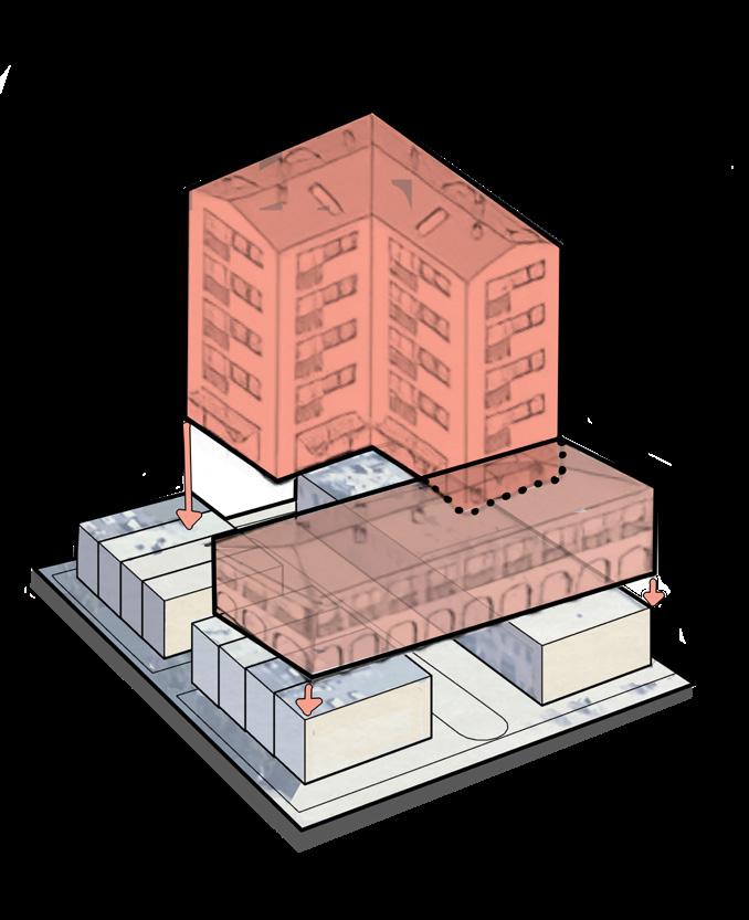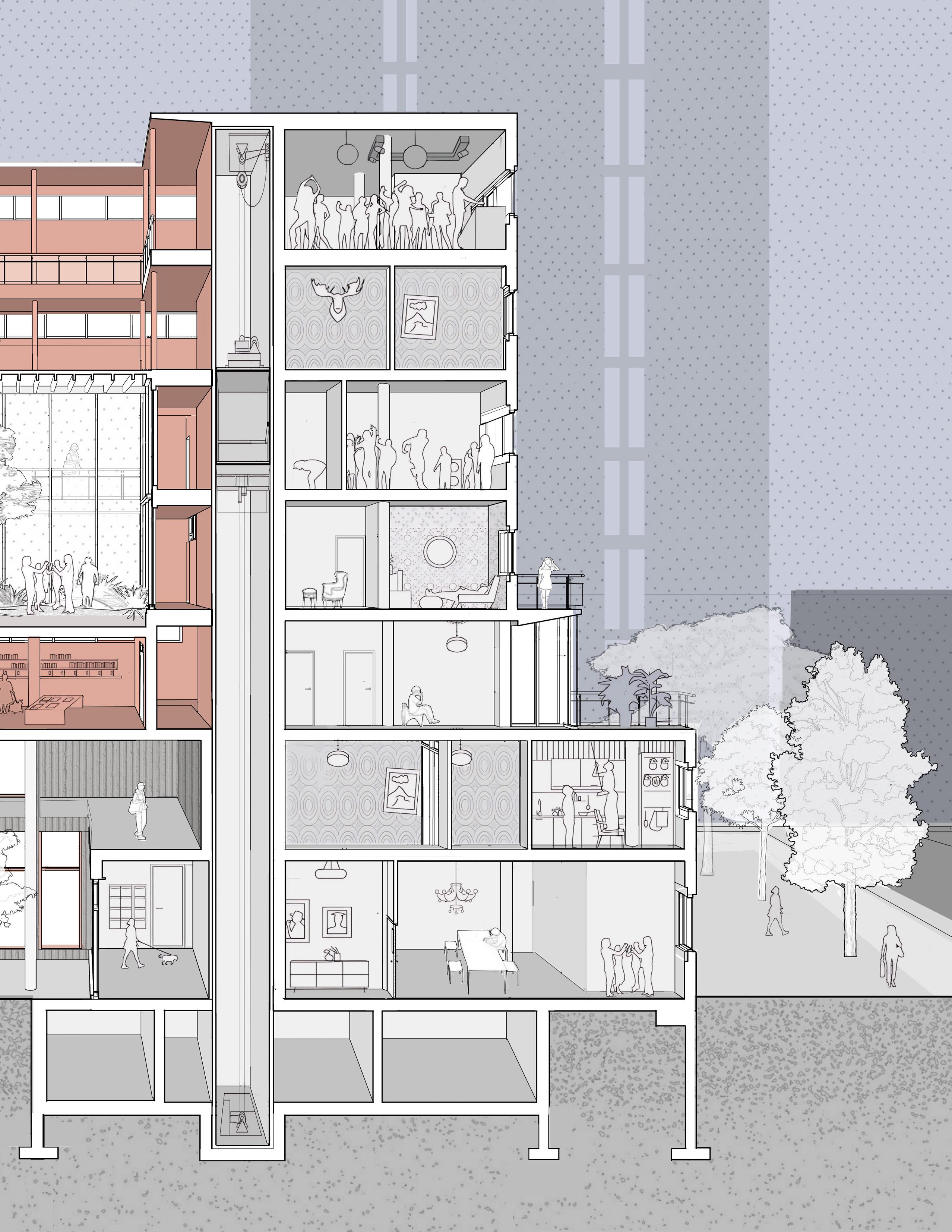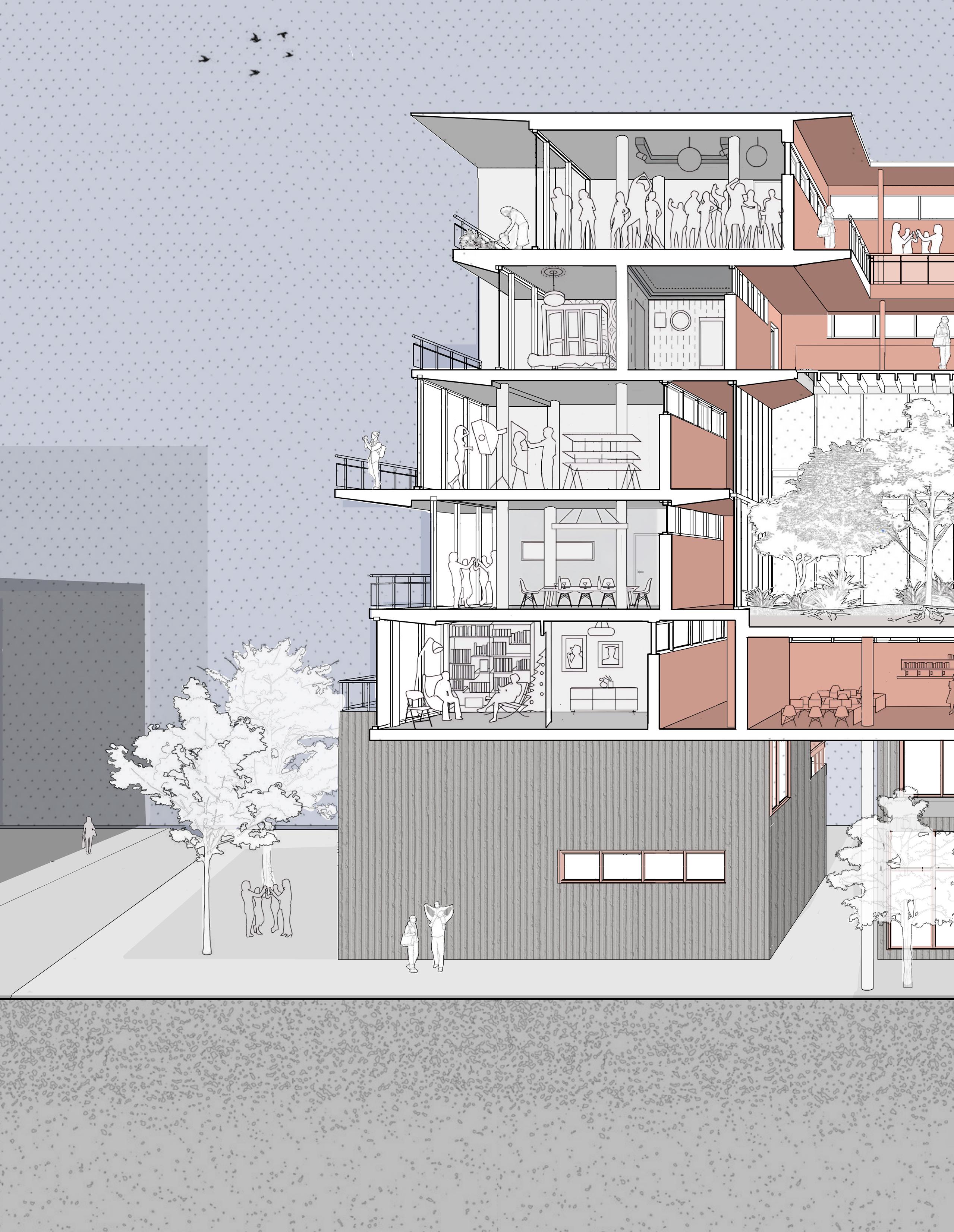 A 47-unit mid-rise housing concept aims to address the missing middle housing crisis in Toronto. The building hosts 3 bedroom townhomes to studio units, housing a wide demographic of local residents. Units on the ground floor are 2-stories, emulating the townhouse streetscape. The circulation for this housing model is based around outdoor, communal circulation pathways and addresses the sites’ critical location, having three street-facing facades along pedestrian walkways.
