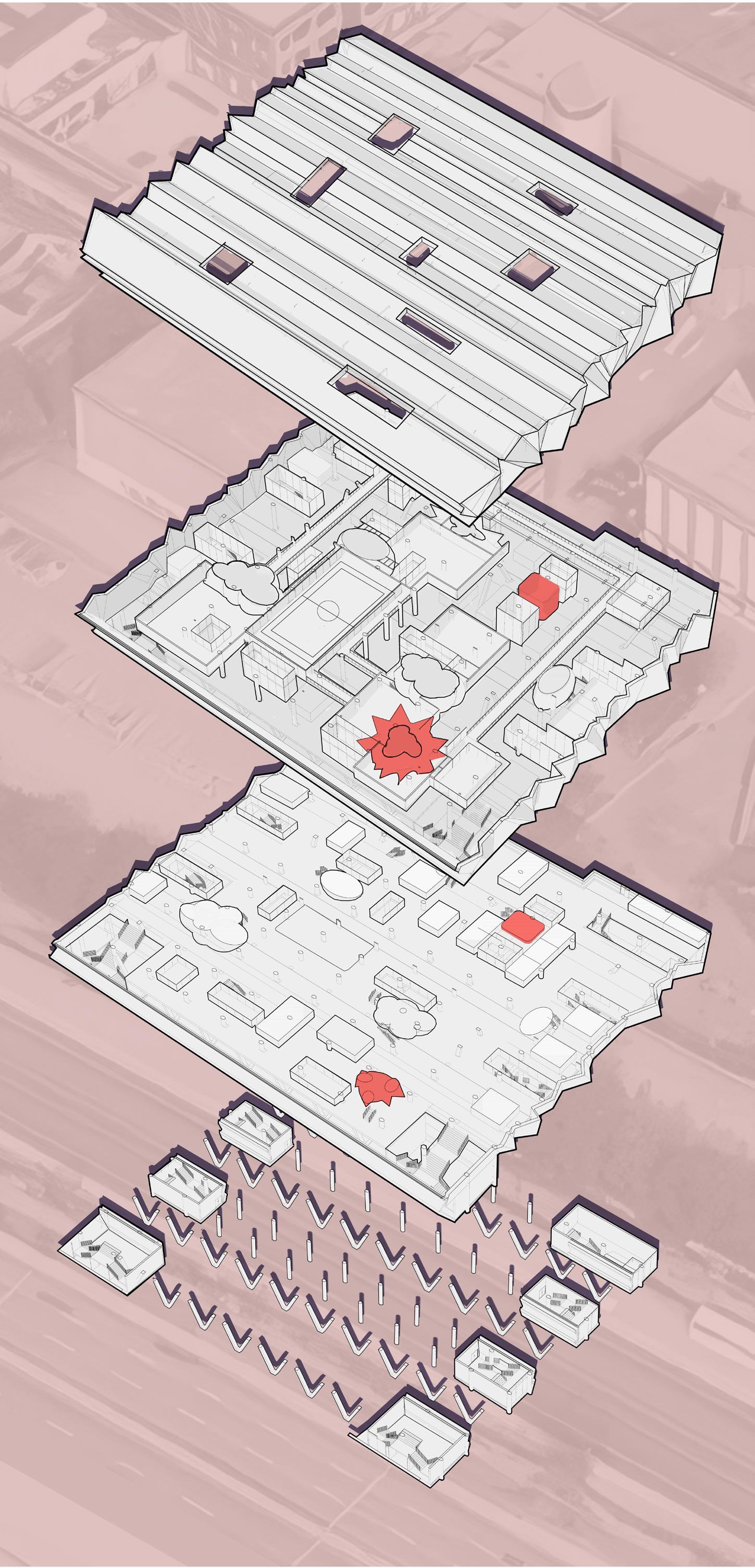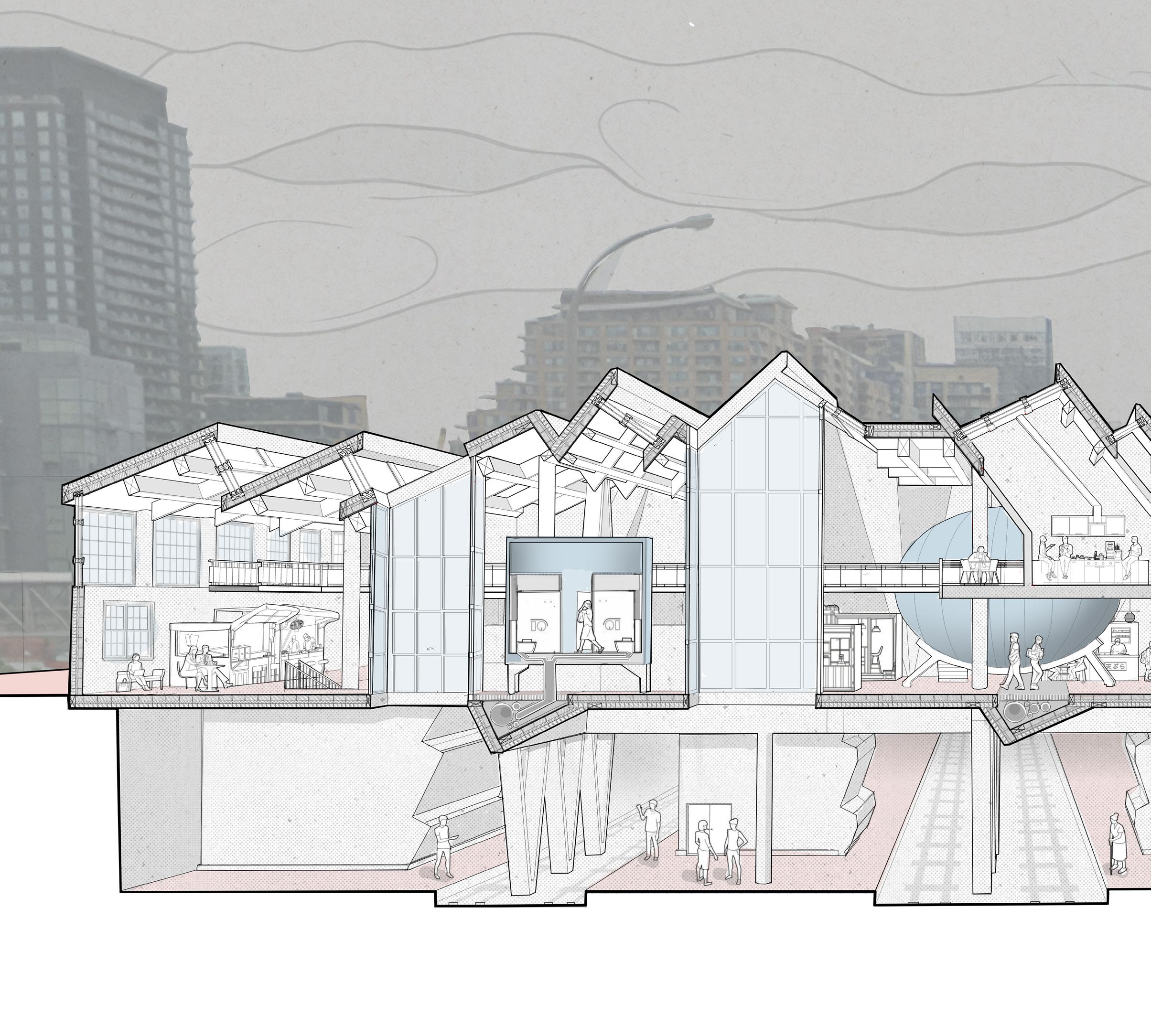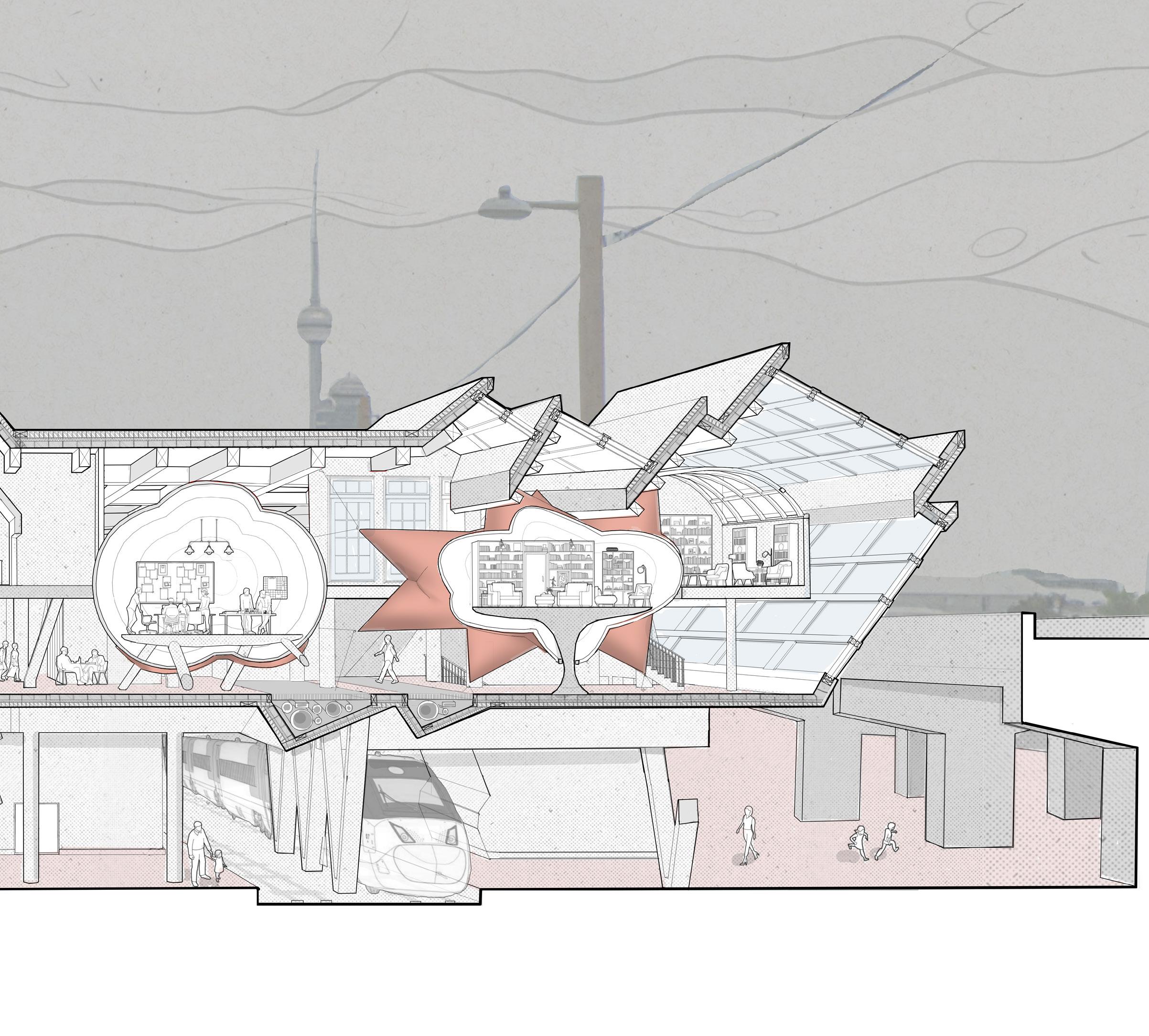 The Exhibition Station is imagined as a piece of civic infrastructure that stretches along the rail corridor to create continuity where the city usually breaks apart. It isn’t a single object but a field of crossings. The building is a way to disperse the heavy flow of people leaving Exhibition Place and fold it back into the neighbourhood. The brick base carries the weight of Liberty Village’s industrial past, acting as a grounded layer that absorbs the movement above it. A steel frame rises from this base and holds a series of modular rooms that include shops, classrooms, and studios