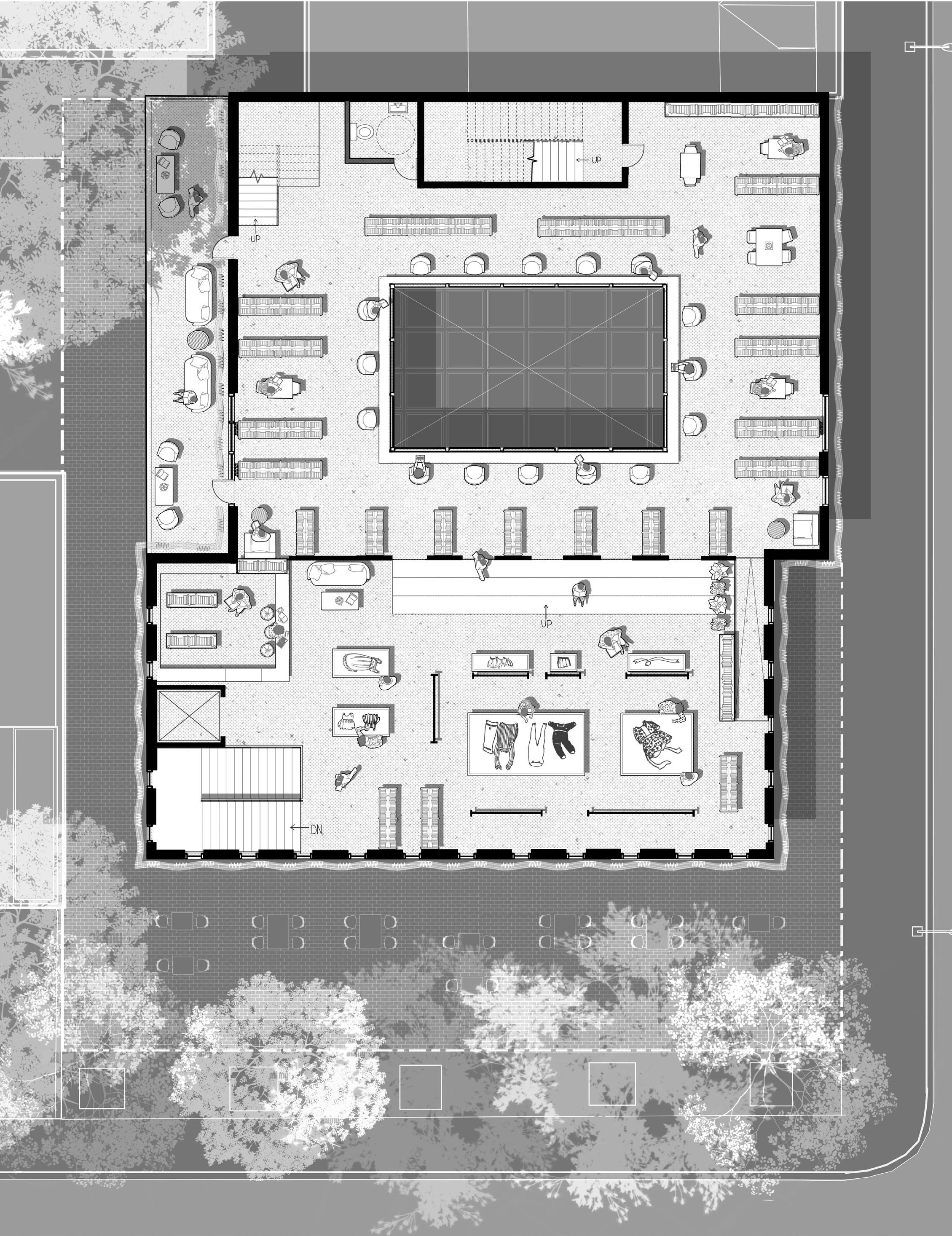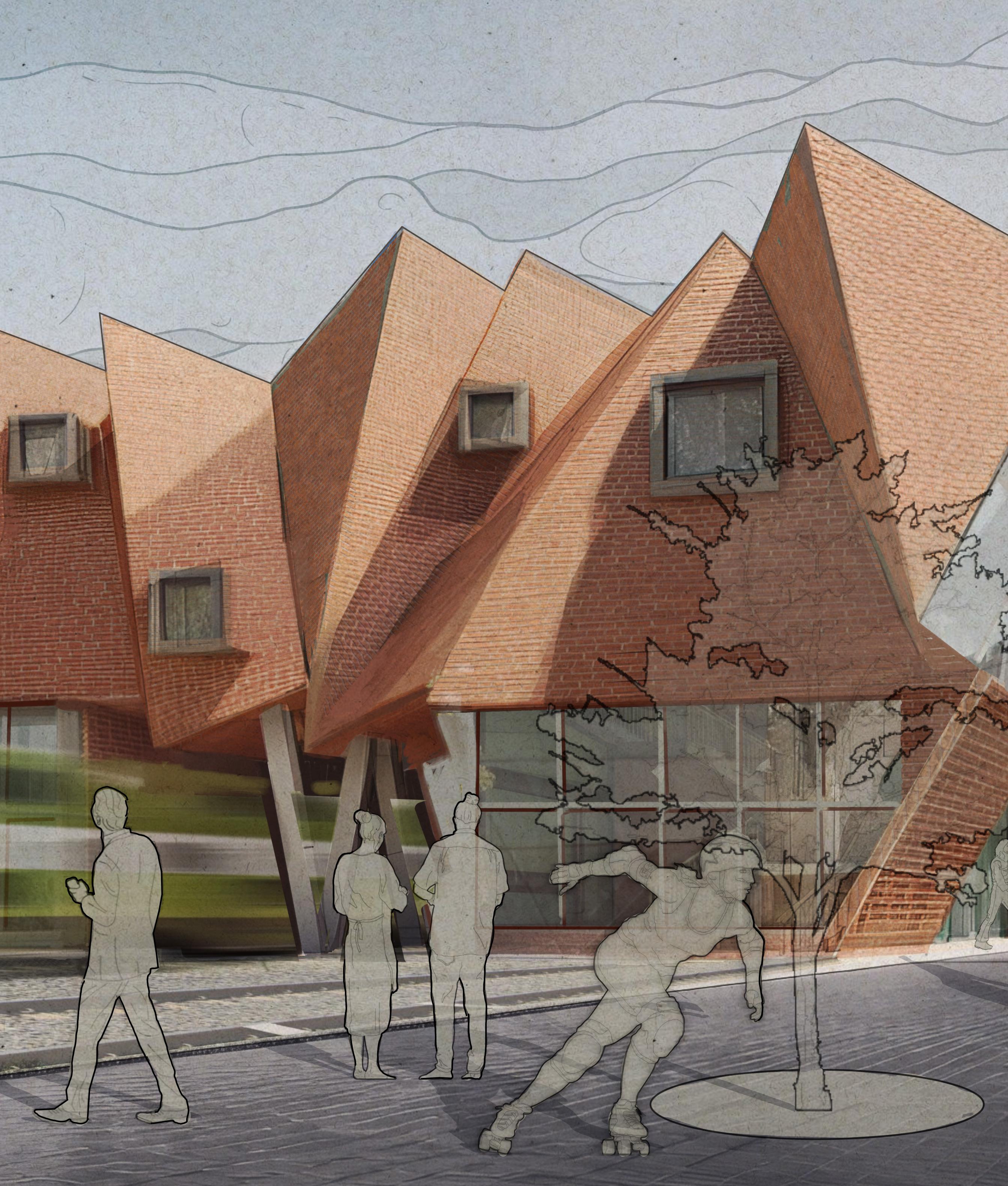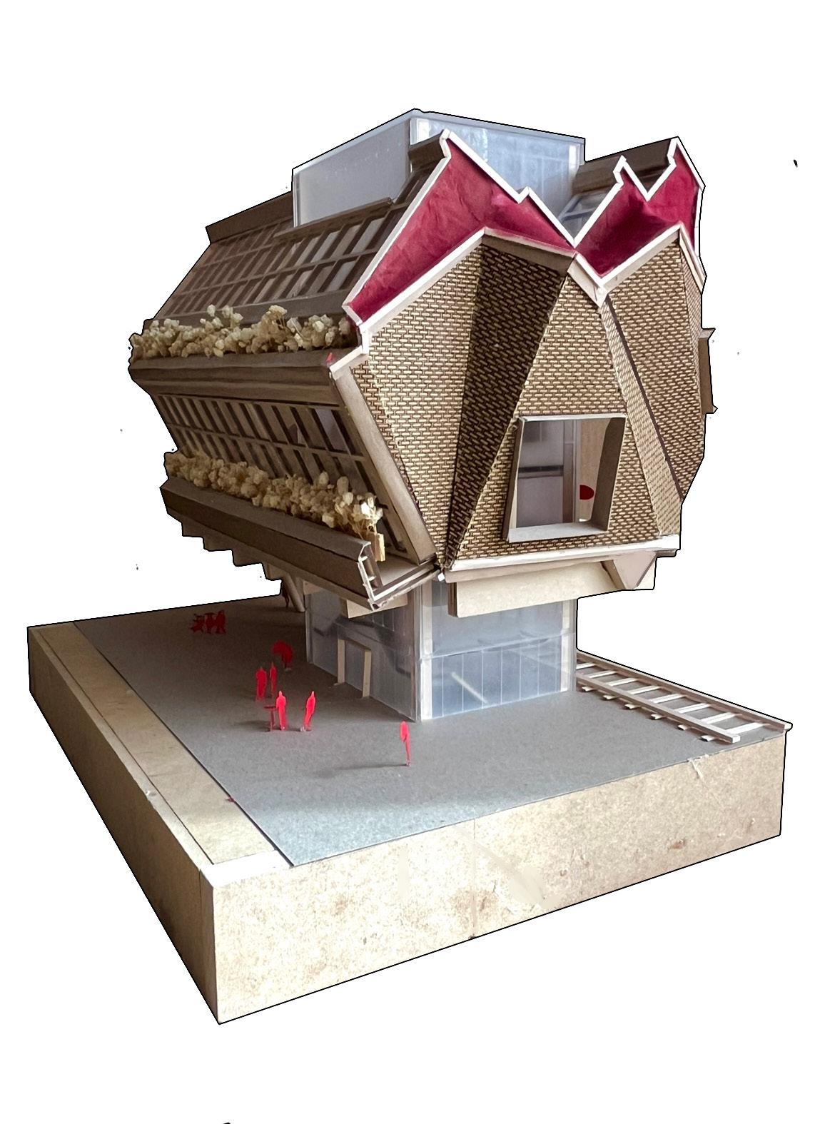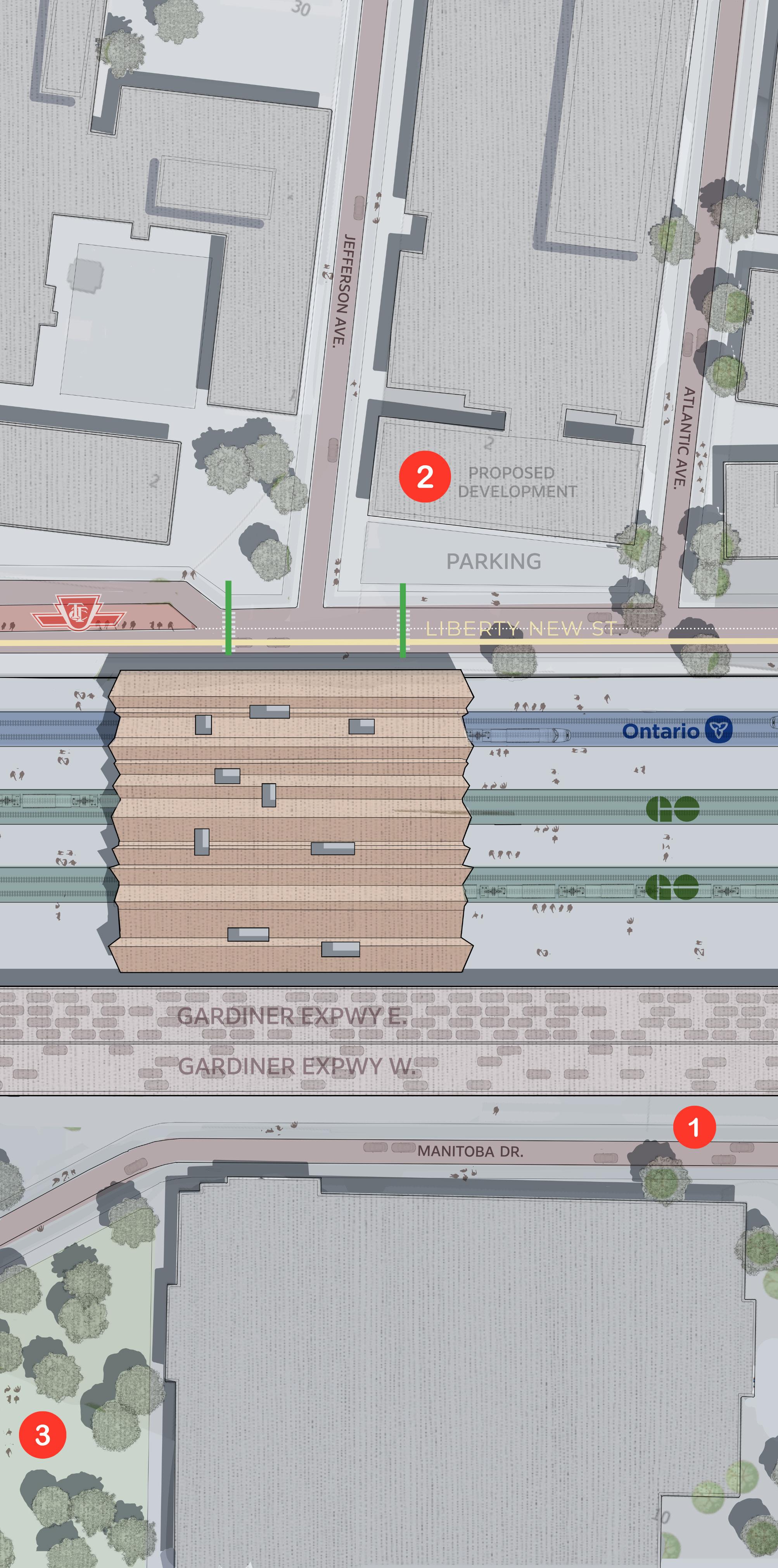 The Exhibition Station is imagined as a piece of civic infrastructure that stretches along the rail corridor to create continuity where the city usually breaks apart. It isn’t a single object but a field of crossings. The building is a way to disperse the heavy flow of people leaving Exhibition Place and fold it back into the neighbourhood. The brick base carries the weight of Liberty Village’s industrial past, acting as a grounded layer that absorbs the movement above it. A steel frame rises from this base and holds a series of modular rooms that include shops, classrooms, and studios