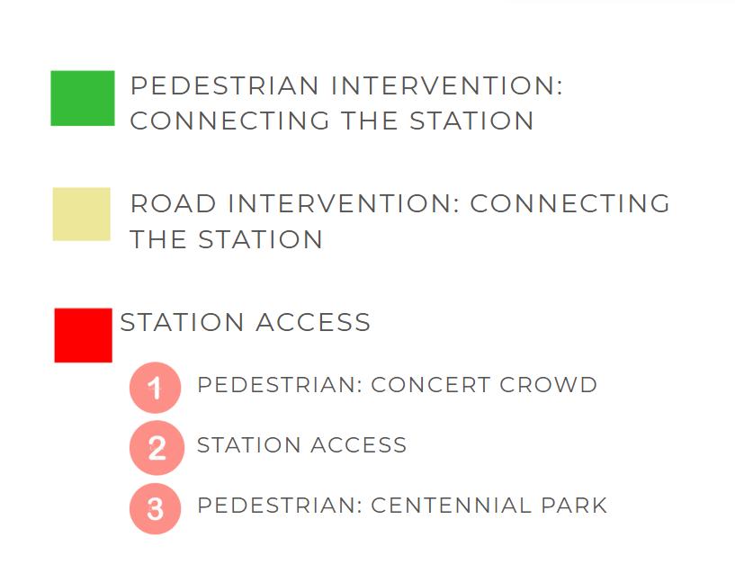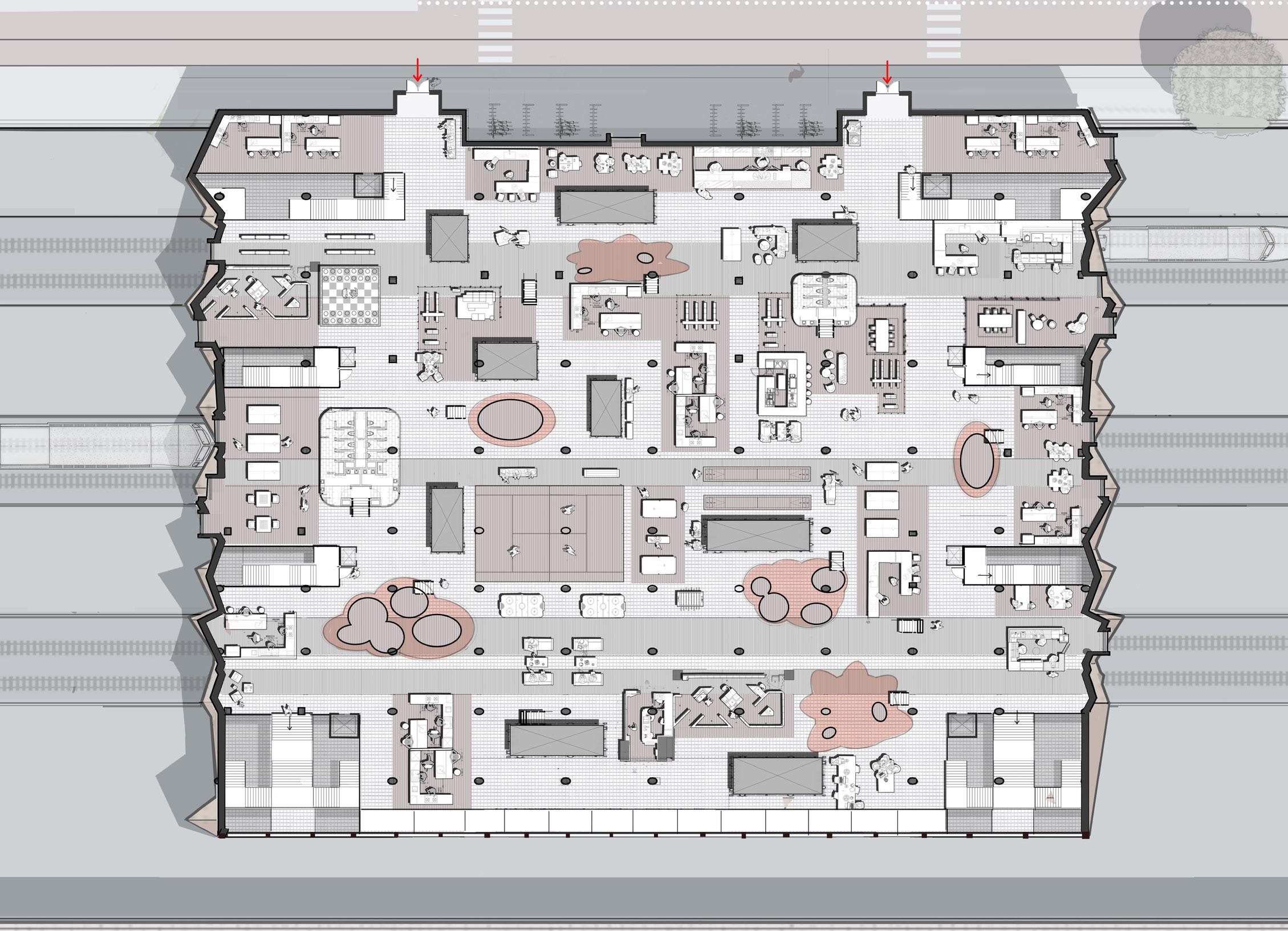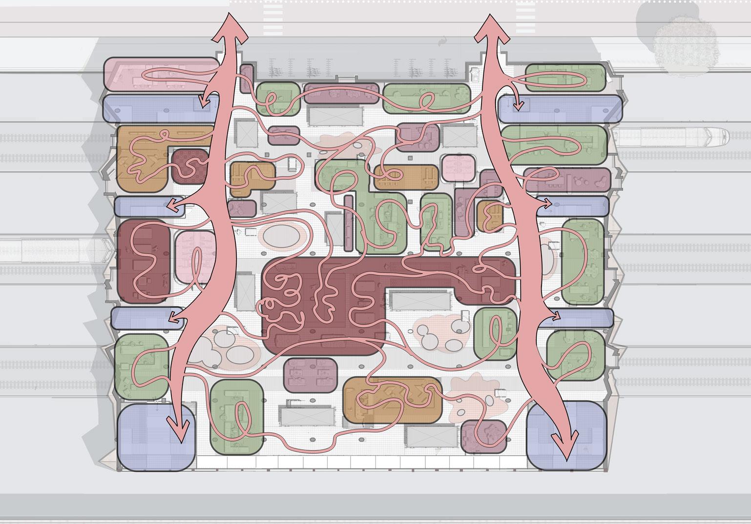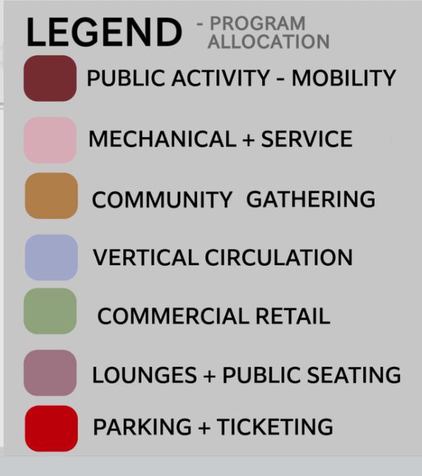 The station is a continuous field of movement rather than a single linear path. Public mobility routes form the primary spine, branching into secondary loops that pass through commercial, community, and lounge spaces as identified in the legend. Vertical circulation anchors these flows at key nodes, allowing movement to shift between levels.