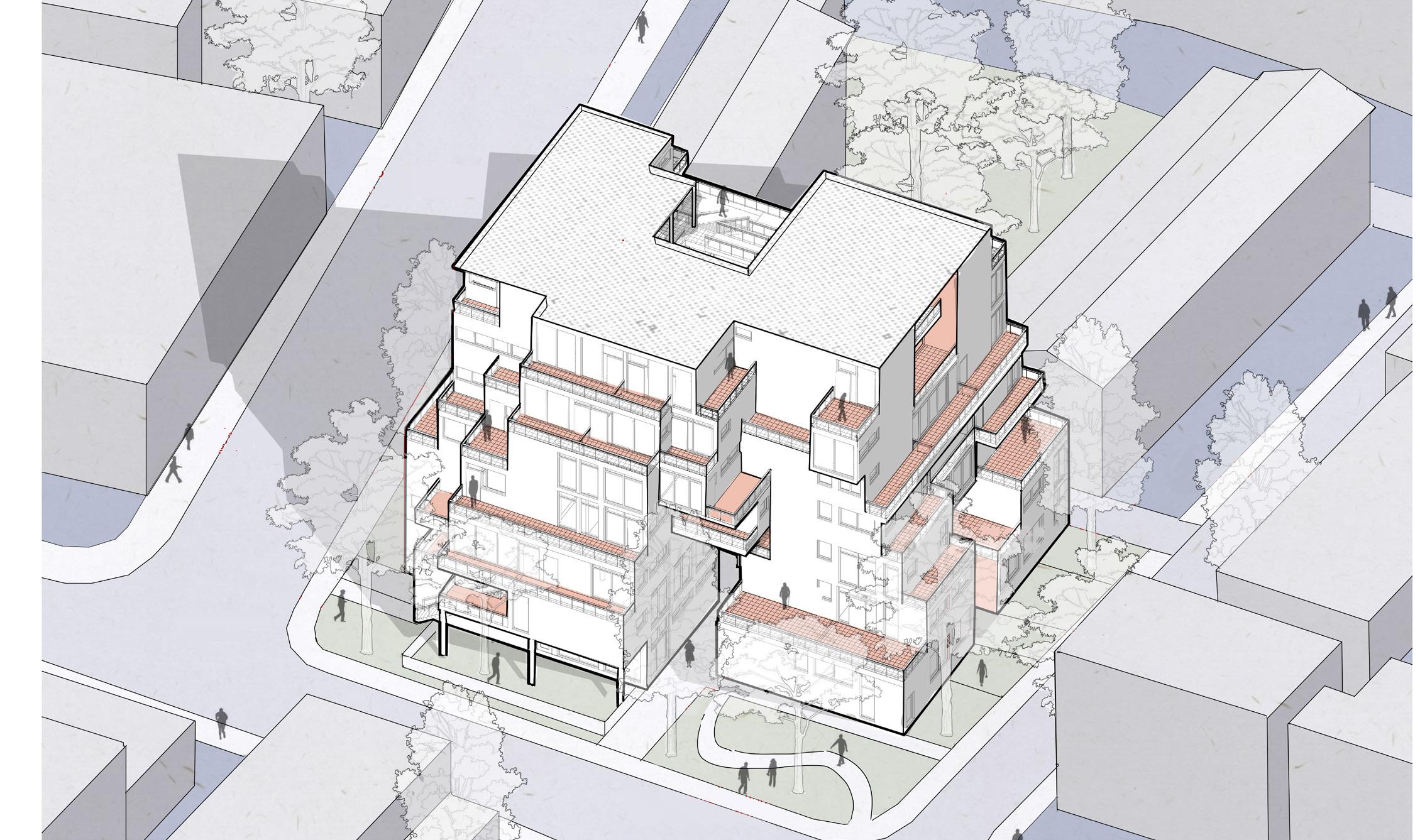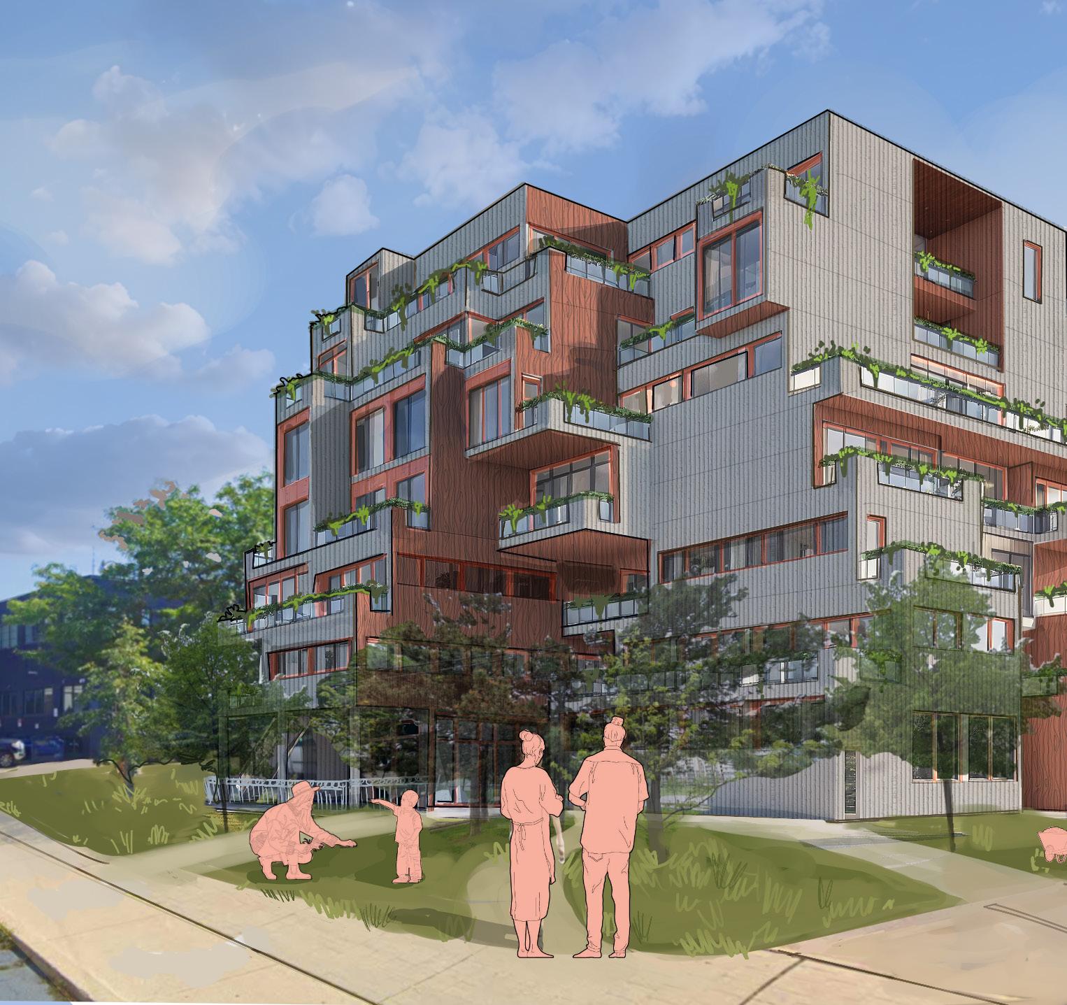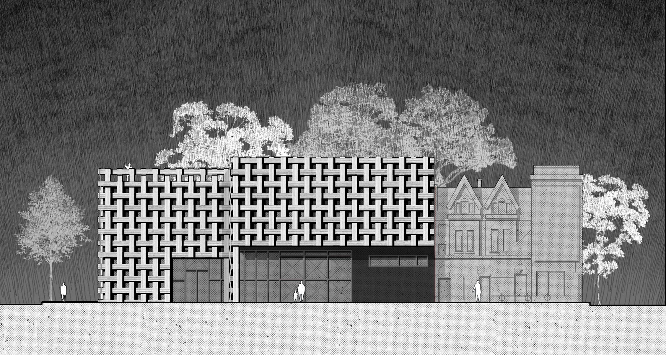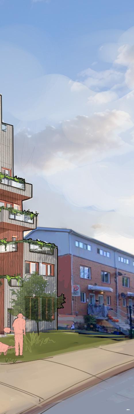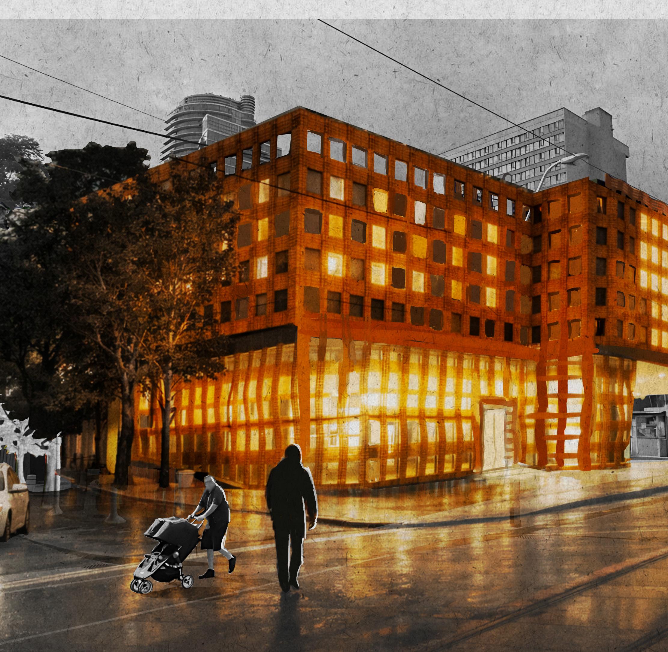 This infill housing project aims to create highdensity housing in the Trinity Bellwood neighborhood in Toronto. The 4-floor building incorporates walk-up housing, aimed towards the student population in the area.
