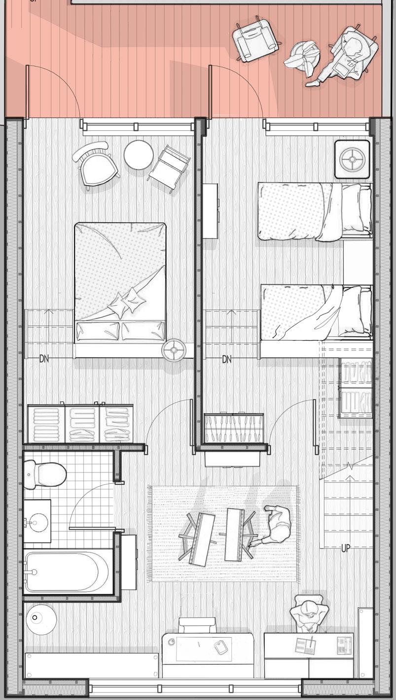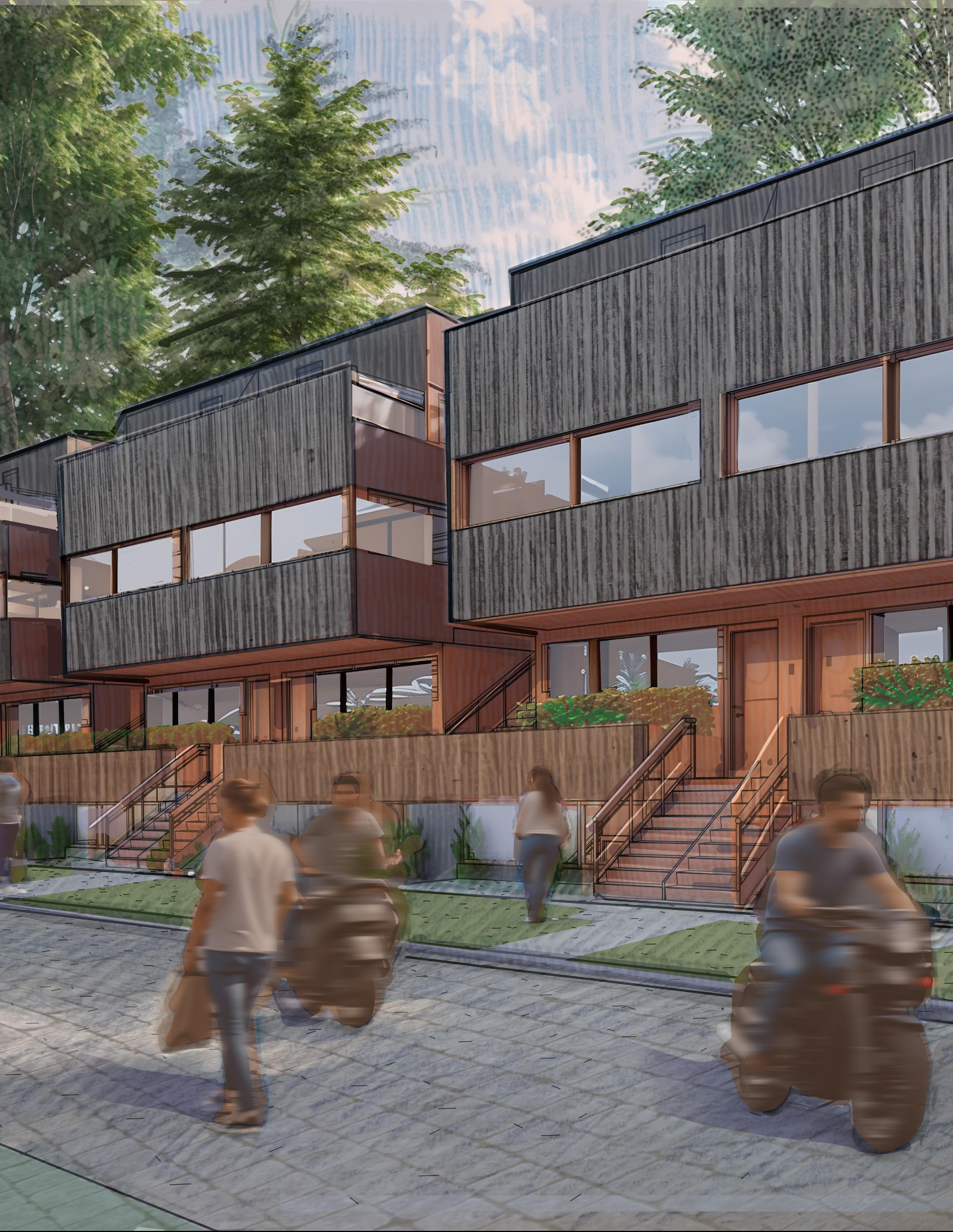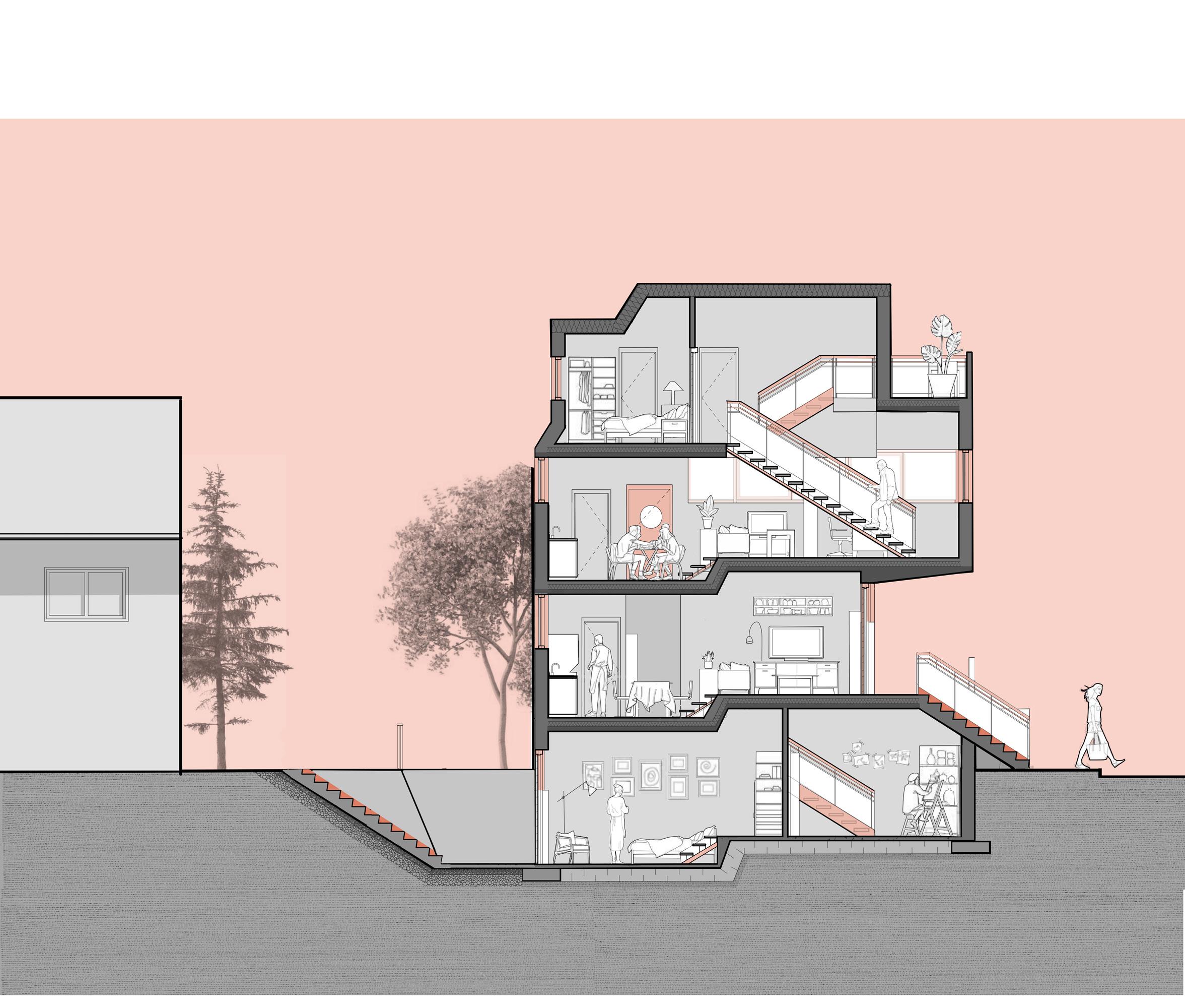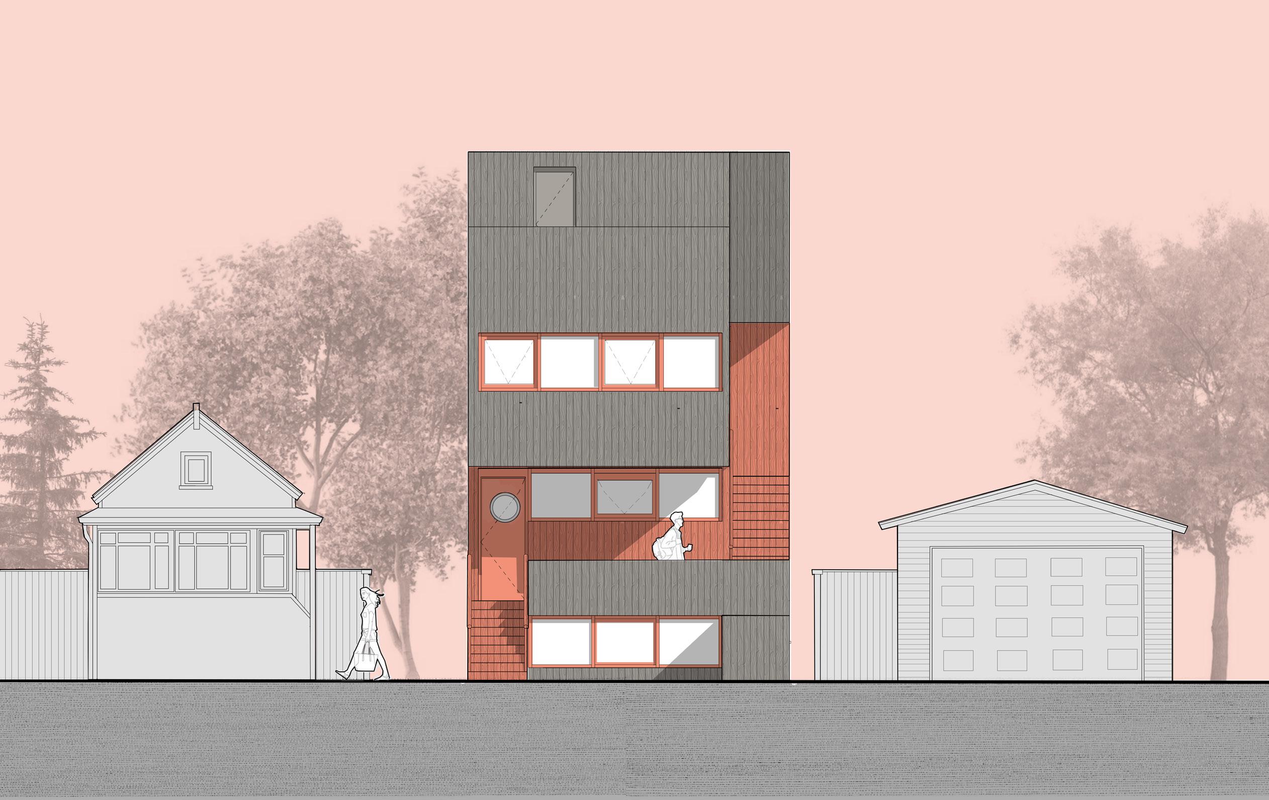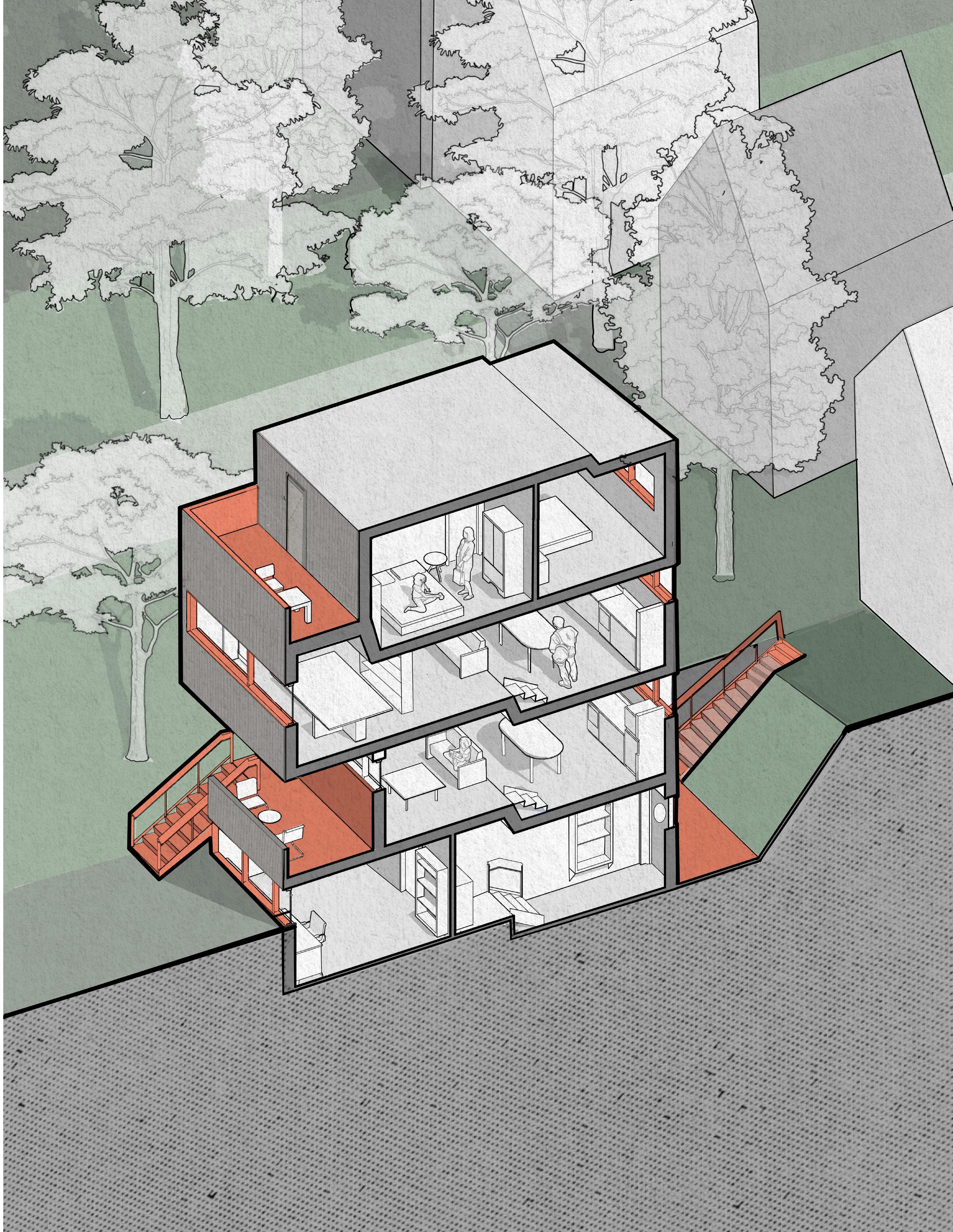 The project looks to the future of the streetscape, creating a duplex that can be terraced to create a high-density housing block while maintaining a human-scaled rhythm along the sidewalk. This approach allows the typology to adapt to varying lot sizes and urban conditions, offering a flexible framework for incremental densification without disrupting the character of the surrounding residential fabric.