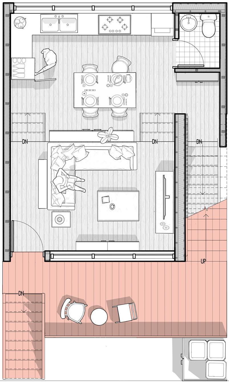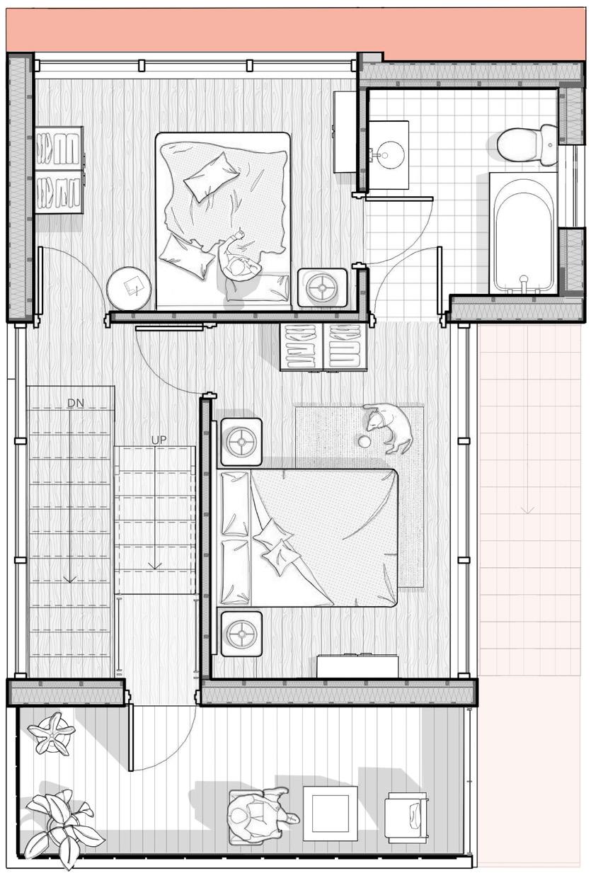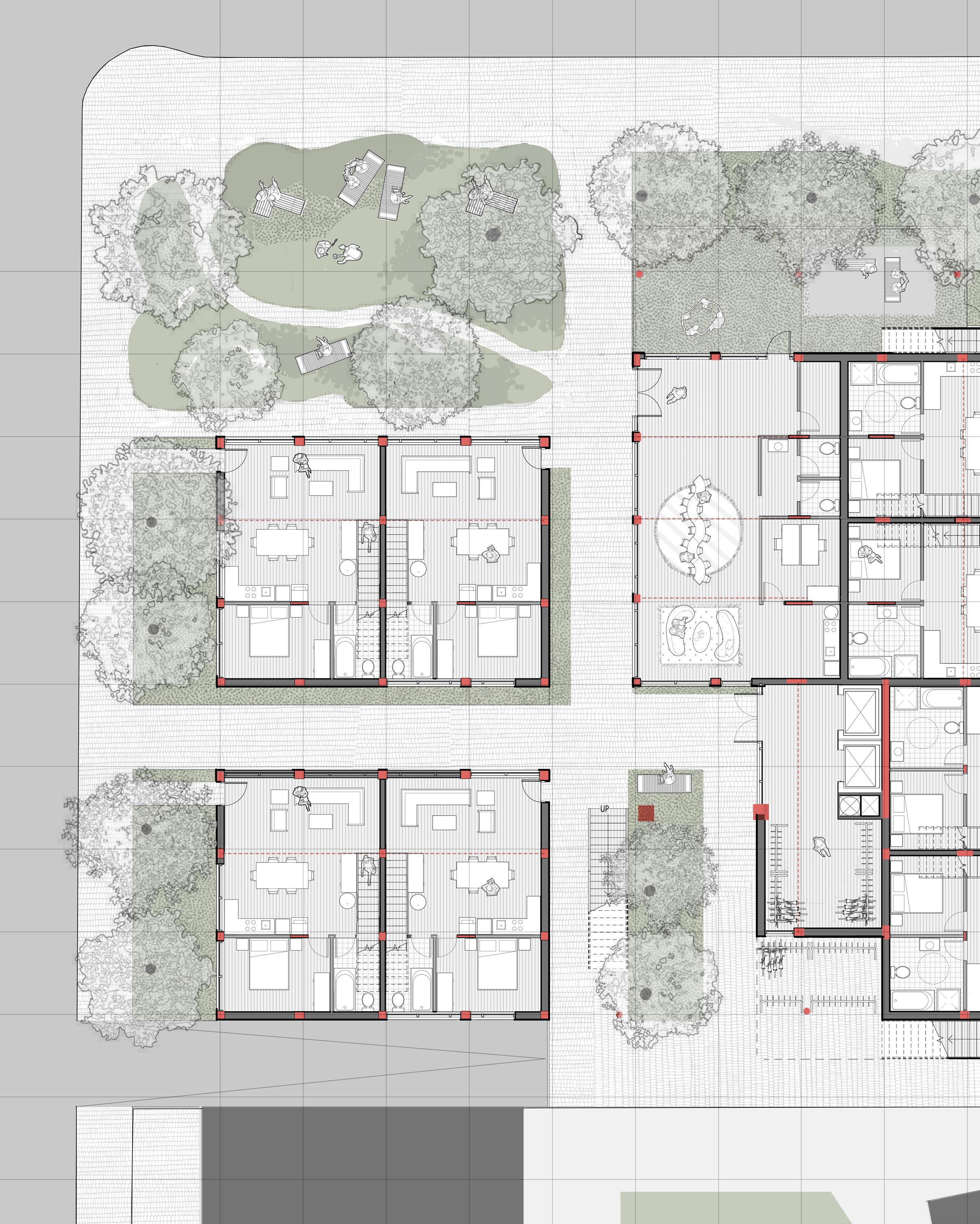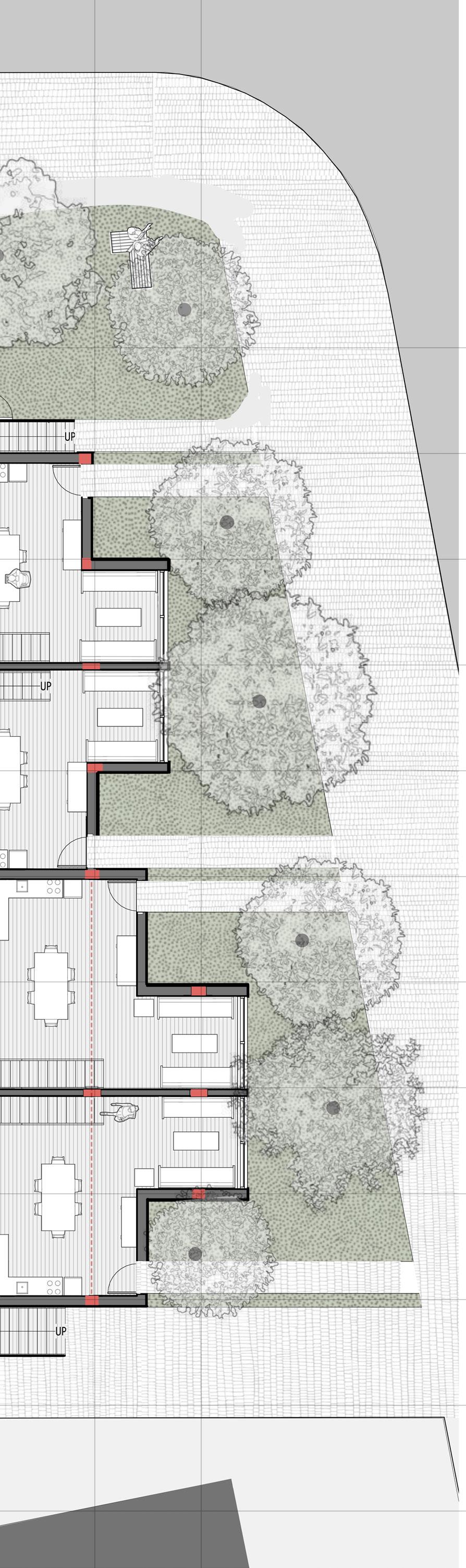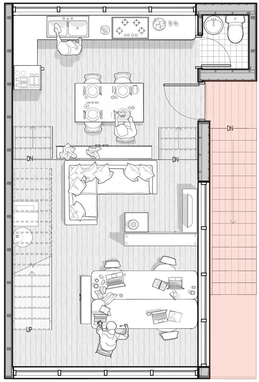 The project looks to the future of the streetscape, creating a duplex that can be terraced to create a high-density housing block while maintaining a human-scaled rhythm along the sidewalk. This approach allows the typology to adapt to varying lot sizes and urban conditions, offering a flexible framework for incremental densification without disrupting the character of the surrounding residential fabric.