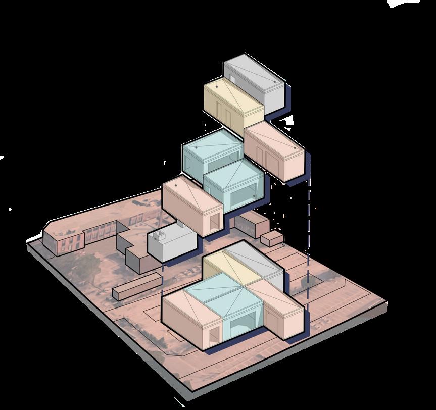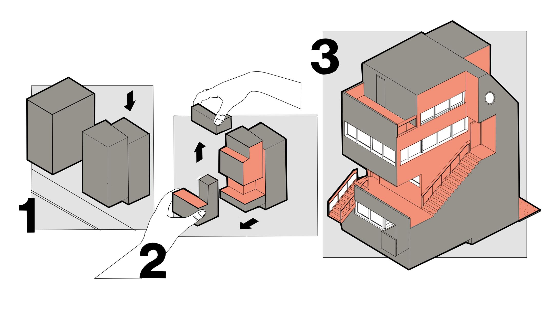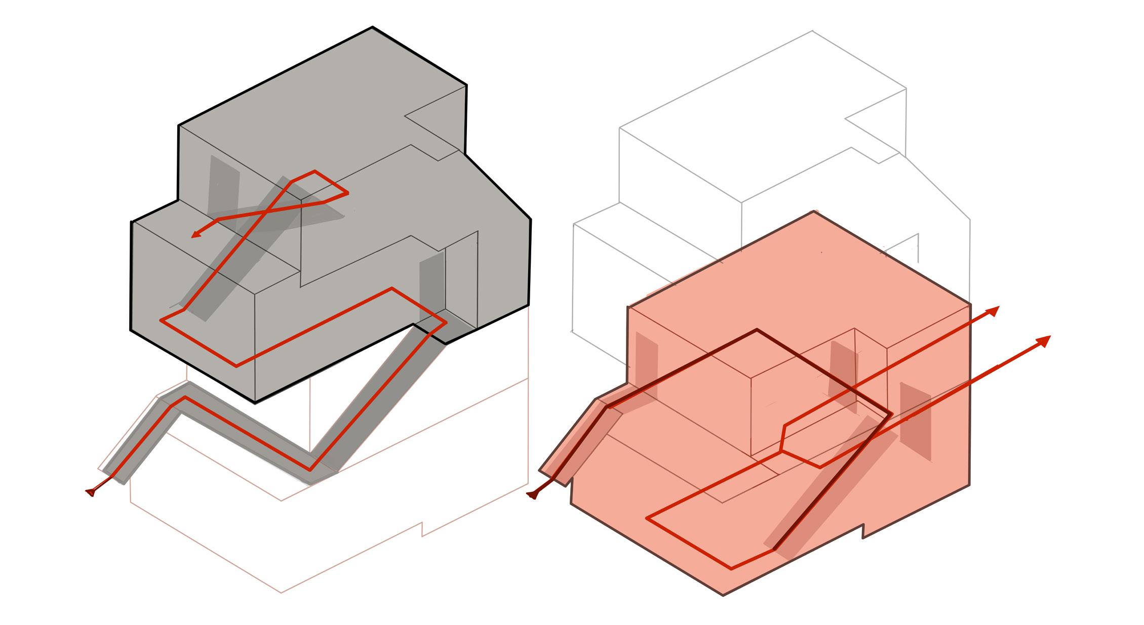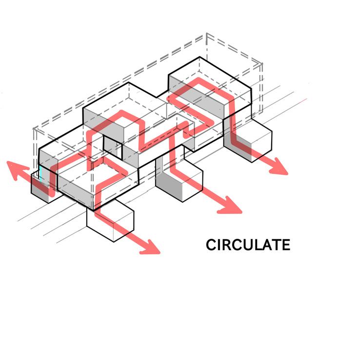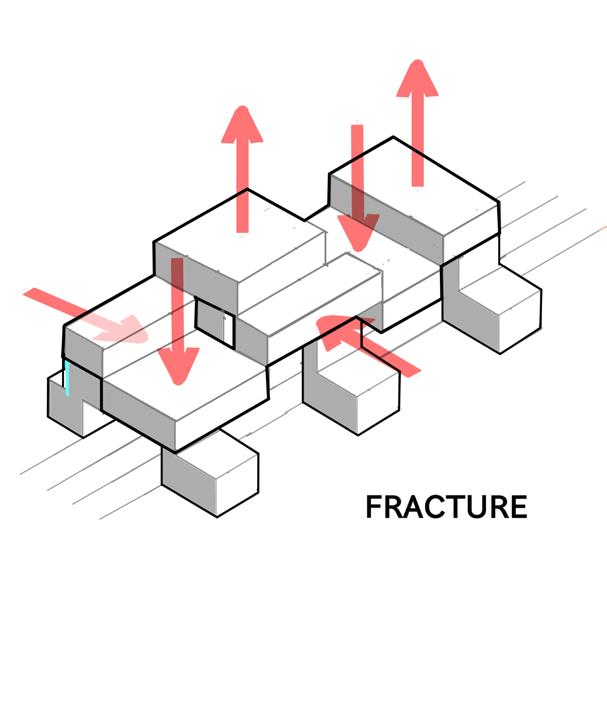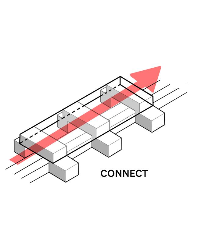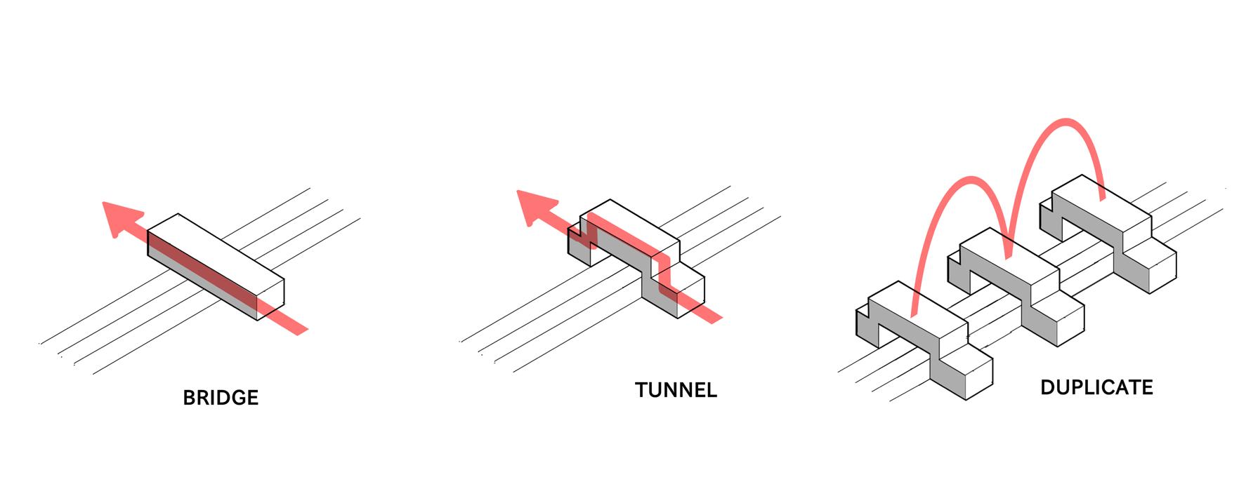 The parti diagram outlines a sequence of spatial operations that transform the station from a single crossing into a distributed field of movement. Beginning as a bridge and tunnel, the form duplicates and fractures to accommodate multiple paths across the rail corridor. These shifts allow the building to connect neighbourhoods while dispersing pedestrian flow. Circulation is pulled through, around, and between volumes, producing a porous infrastructure that prioritizes continuity, adaptability, and layered movement rather than a singular architectural object.