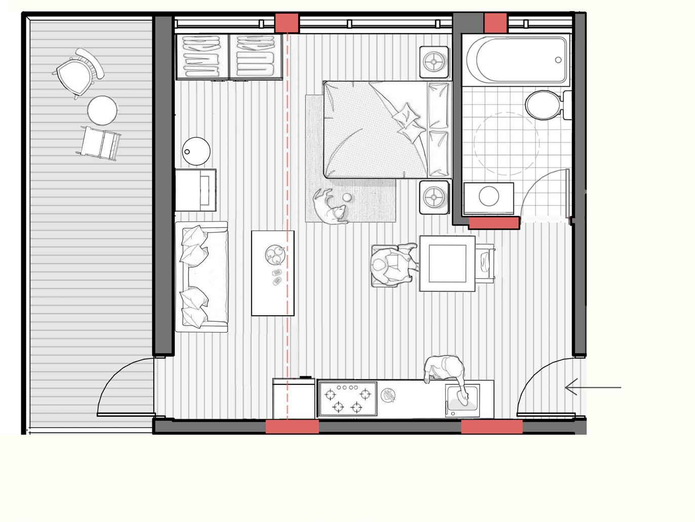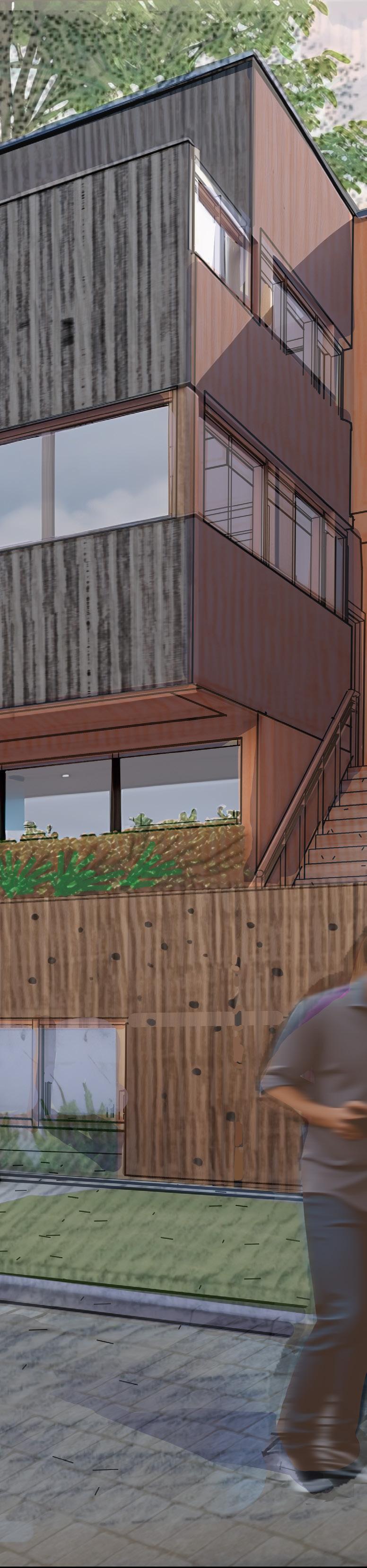 The materiality of the building aims to bridge the private and pedestrian realms through the extensive exterior sitting spaces and long, horizontal lines throughout the building facade. The organic materiality of the building, being a mix of ash treated oak and redwood provide warmth to the overlooked street, bolstering the pedestrian