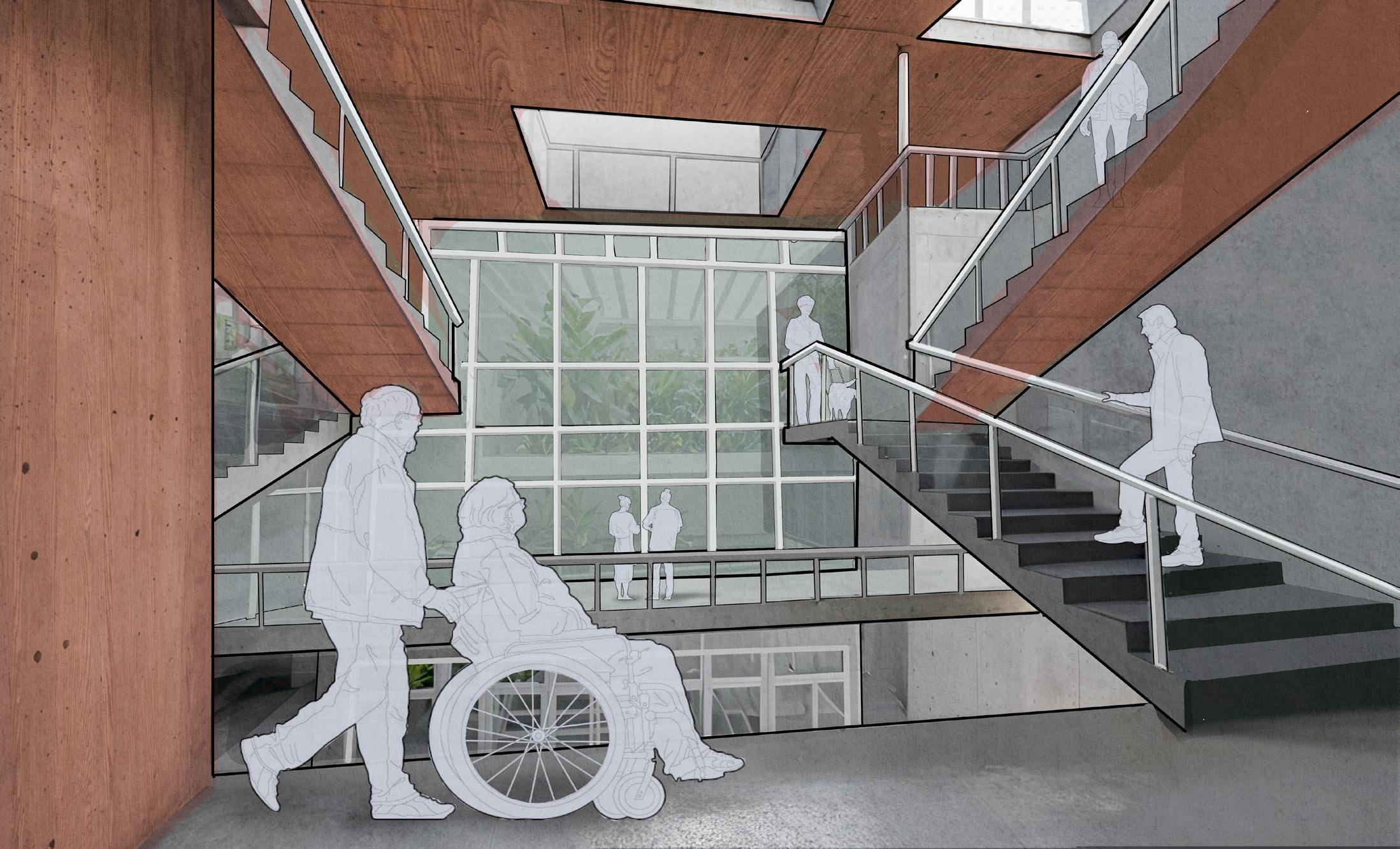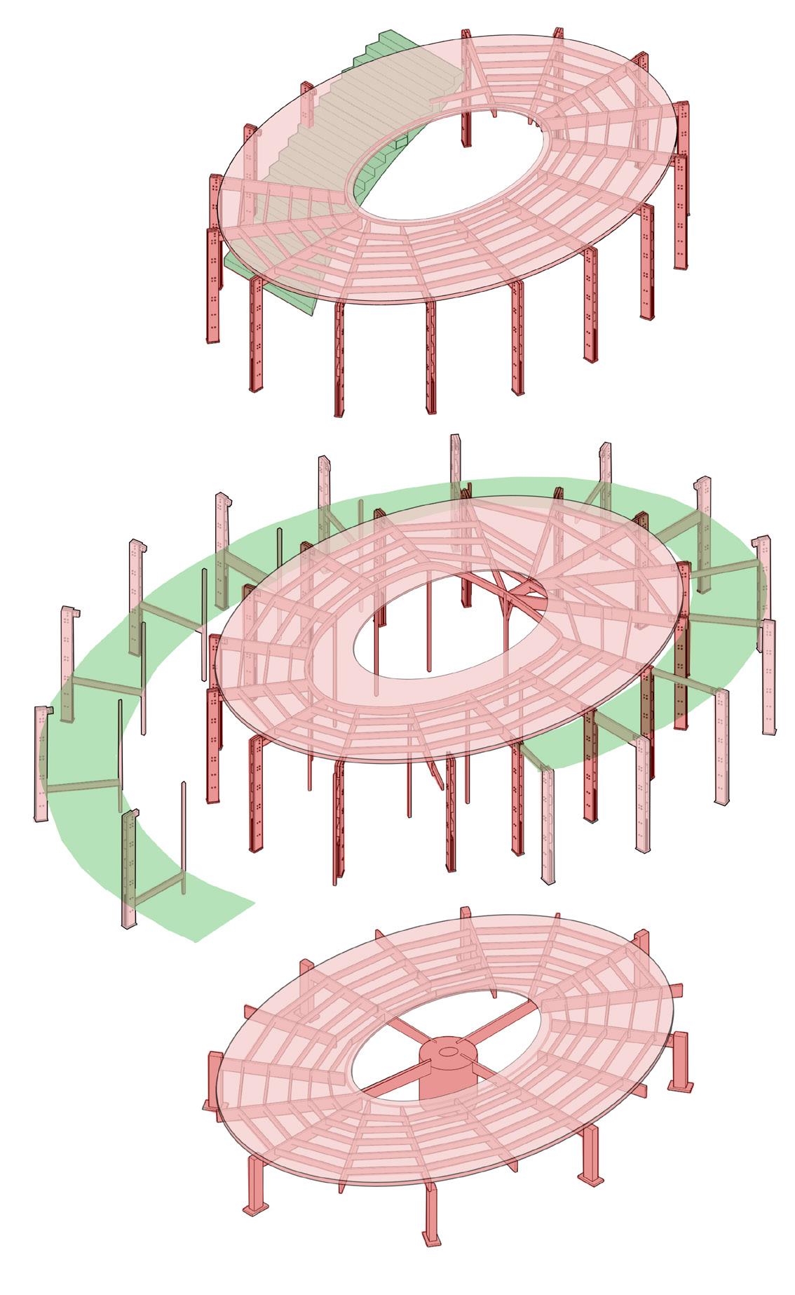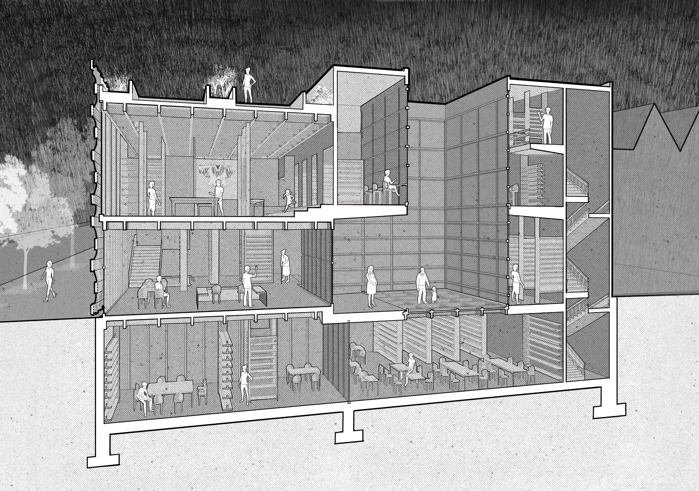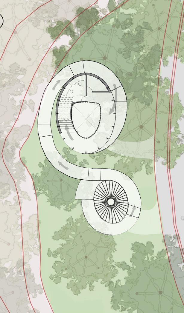 explore, like a natural feature of the urban park. The building is organized around a gentle ramp system that ensures universal accessibility while reinforcing a continuous spatial experience.