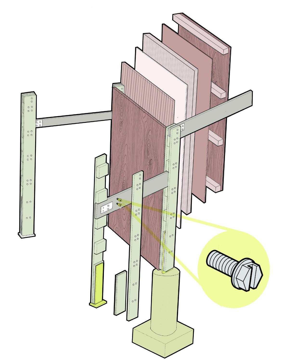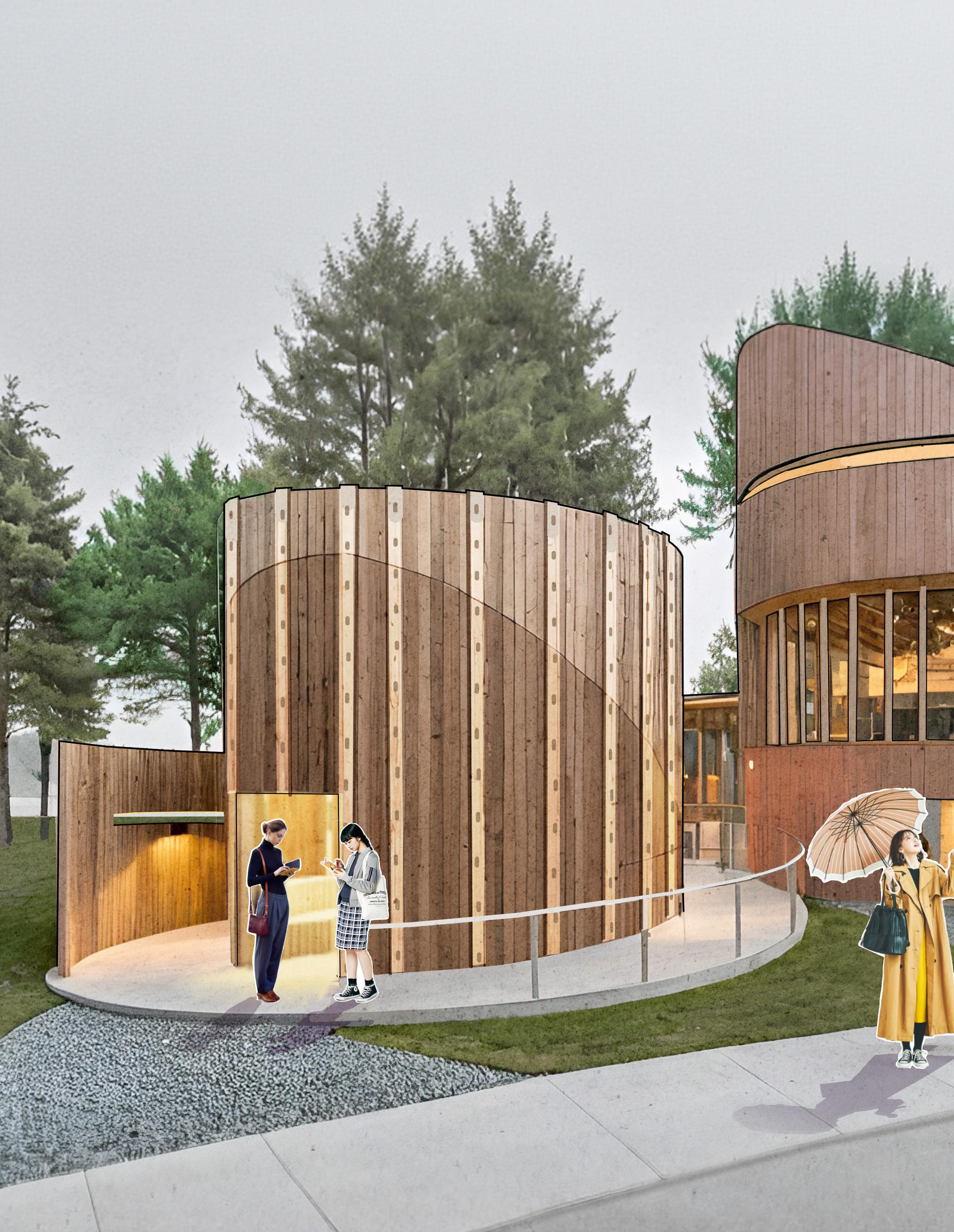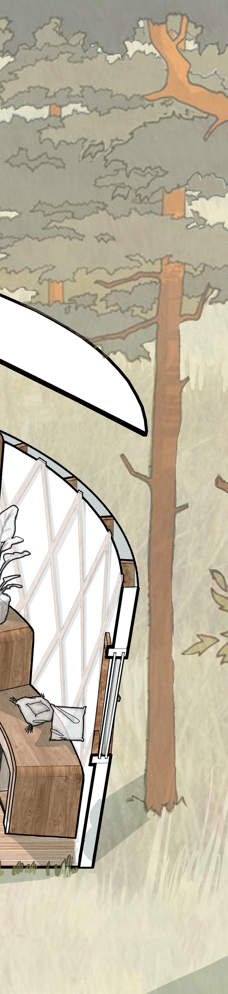 The materiality of the structure emulates the colours and smells of the immediate greenscape, using Red Oak and Sugar Maple structural and cladding elements to form the building. This lowimpact building aims to blend into the surrounding foliage, a place for visitors to hike up and