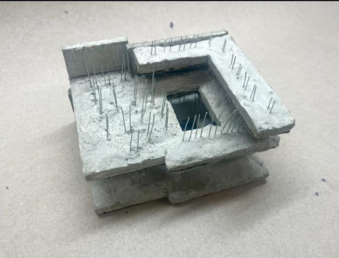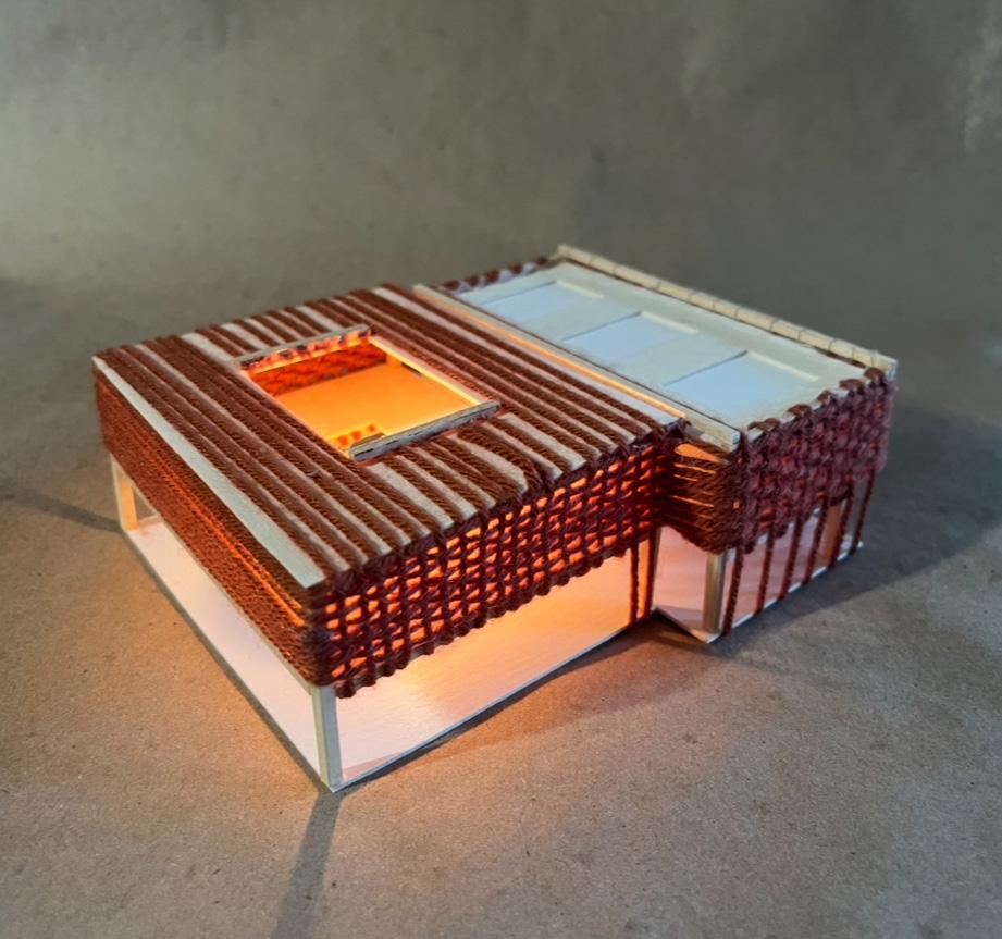 The design of Tessitura emerged through a hands-on iterative modeling process that tested material and light. A concrete sketch model established the building’s mass and solidity. This was followed by a loose thread model woven around wooden sticks, exploring porosity and movement. A tighter weave then refined the system, directly informing the corten façade. This process clarified how light could be filtered and revealed, shaping the building’s final daylighting and tectonic expression.