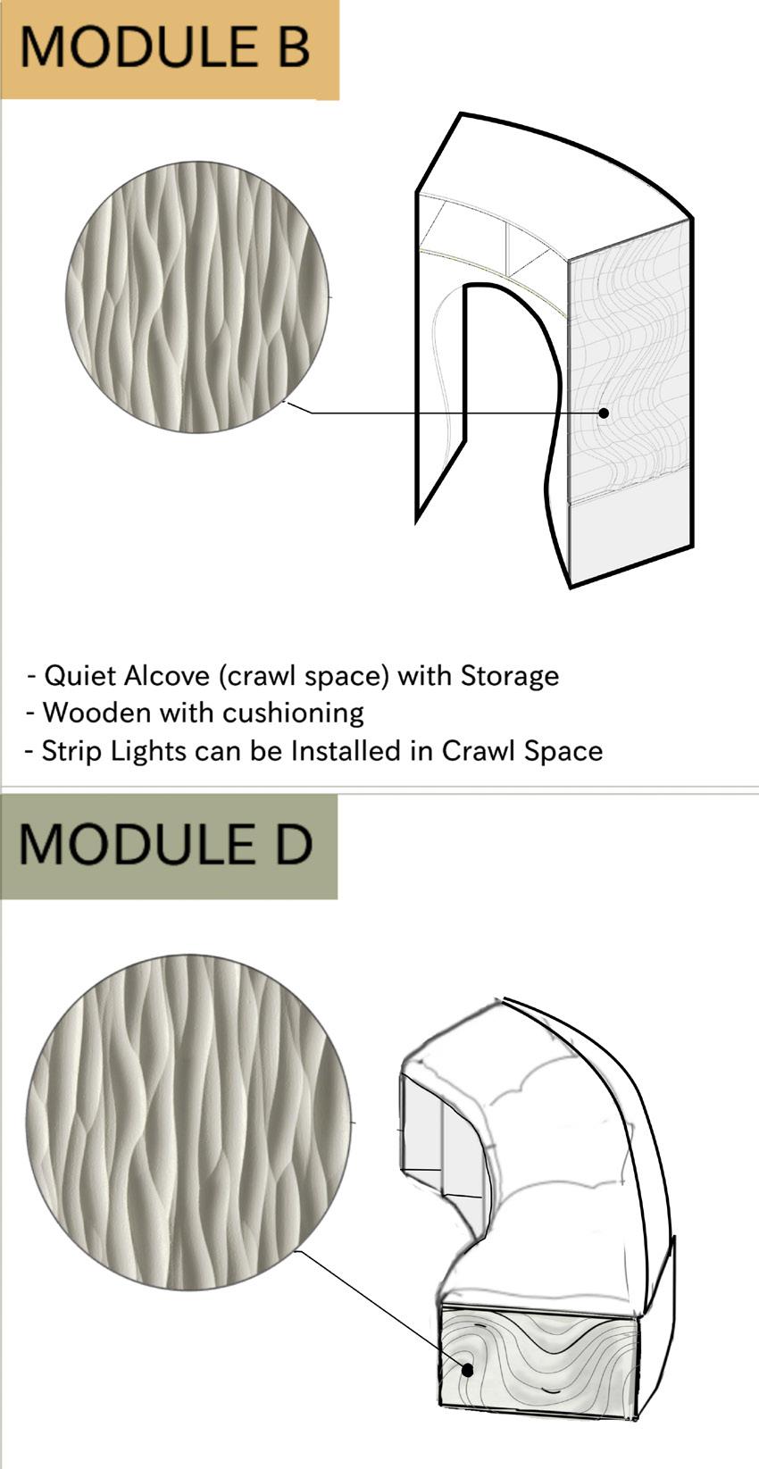 The design lines the perimeter with modular wooden shelves, benches, and alcoves that can be rearranged to accommodate a wide range of sensory needs and preferences. This flexibility allows the space to adapt between calm retreat and active engagement, reflecting the camp’s commitment to comfort, creativity, and