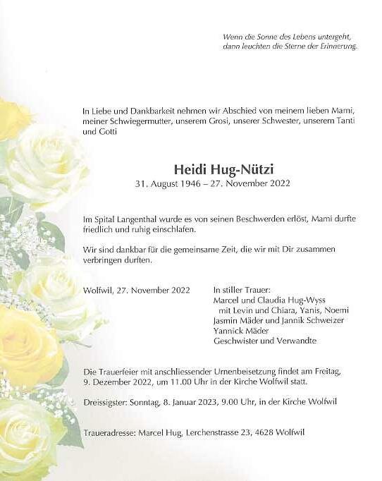 Preise vom 22.11.22 22.11.22 6.12.22 801– 1 499 Lt. 149.00 142.70 142.00 1 500– 2 199 Lt. 143.63 137.30 136.60 2 200– 2 999 Lt. 142.10 135.10 134.50 3 000– 4 499 Lt. 137.70 131.30 130.70 4 500– 5 999 Lt. 136.60 130.30 129.60 6 000– 8 999 Lt. 136.10 129.70 129.10 9 000–13 000 Lt. 134.80 128.40 127.80 Quelle: Brennstoffhändler der Region. Die aktuellen Preise erhalten Sie be Ihrem Brennstoffhändler. Heizöl-Barometer der Region Preis per 100 Liter Dr Azeiger bringt’s! Wir helfen krebskranken Menschen Helfen Sie mit Dieses Inserat kostet ke ne Spendengelder Neu in Oensingen! AUGENZENTRUM OENSINGEN Sternenweg 14, 4702 Oensingen (Oberhalb von COOPnebenALDI) FürAugenarzt Termin: 0800 802 488 / 062 296 9900 +41 79 811 9900 10248195 10063560 BegleitungimTodesfall persönlichundvertrauensvoll bestattungwagner.ch TagundNacht 0623981233 Regionaleroffiz Besta ungsdienstseit1977 Besta ungenWagner 4622Egerkingen 10247183-10064767 Grico Druck AG | 4716 Welschenrohr | www gricodruck ch 10244010-10058427 FRISCHE KOCH-IDEE VON IHREM VOLG für 4 Personen 3 Zwiebeln, in feinen R ngen 1 EL We ssmehl Salz, Pfeffer 2 EL Bratbutter 3 Äpfe (z. B Braeburn), in Schnitzen 4 EL Zucker 0,5 dl Wasser 2 dl Vo lrahm 1 dl Mi ch 50 g Emmentaler, gerieben 160 g Zigerbutter Zibu Salz, Pfeffer Wenig Muskatnuss 400 g Hörnli 2 EL Schnittlauch fein geschnitten Zubereitung 1. Röstzwiebeln Zwiebelringe mit Mehl in einer Schüssel mischen, wür zen. In Butter bei mittlerer Hitze 5-8 Minuten goldbraun braten. 2. Apfelschnitze: Schnitze mit Zucker und Wasser 5-8 Minuten köcheln lassen. 3. Zigerhörnli: Rahm und Milch aufkochen, Pfanne von der Platte ziehen, Emmentaler und Ziger beigeben, würzen. Rühren, bis eine sämige Sauce entsteht. Hörnli in siedendem Salzwasser bissfest kochen, ab giessen, abtropfen lassen, mit der Sauce mischen. Mit Röstzwiebeln und Schnittlauch garnieren. Apfelschnitze dazu servieren. Weitere Rezepte finden Sie auf www.volg.ch/rezepte/ Das heutige Rezept: Glarner Zigerhörnli Zubereitung: ca 35 Minuten 10244330-10058884 Die Praxis Dr. med. Silvan Hafner in Wolfwil bleibt vom 24.12.2022 bis und mit 2.1.2023 geschlossen. Vertretung nach Möglichkeit durch die Ärzte der Region. Ansonsten wenden Sie sich an die Notfallnummer: 0848 112 112 1 0 2 4 9 2 0 0 6 5 1