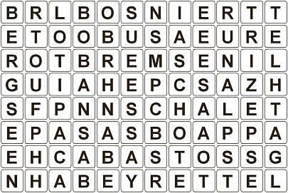 ATHLET, BACHE, BAHN, BERGSEE, BOSNIER, BREM SEN, CAPITOL, CHALET, ESSAY, EURE, HASE, LETTER, MENSCH, NABE, NABOB, PHASE, PLAN, RAPPE, SAEURE, SCHOTE, SPUR, STOSS, TRIZEPS, UBOOT